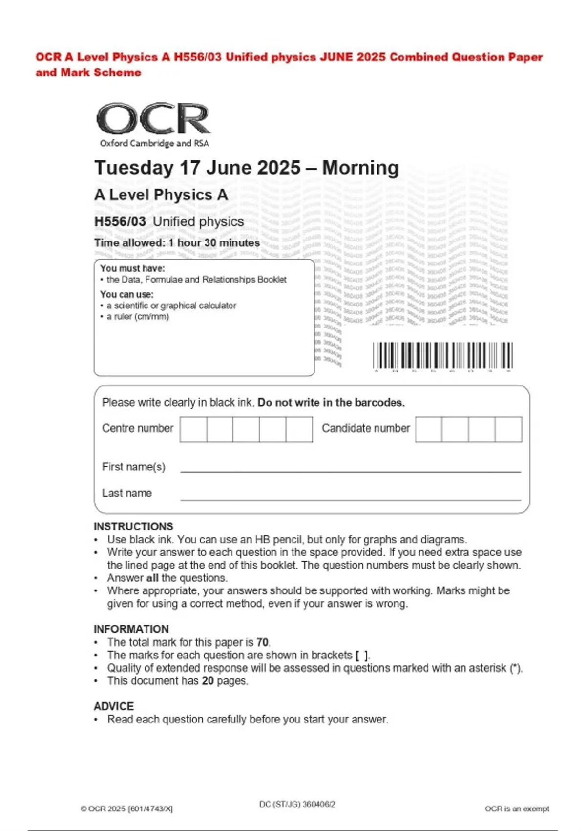 OCR A Level Physics A H556/03 Unified physics JUNE 2025 Combined Question Paper and Mark Scheme