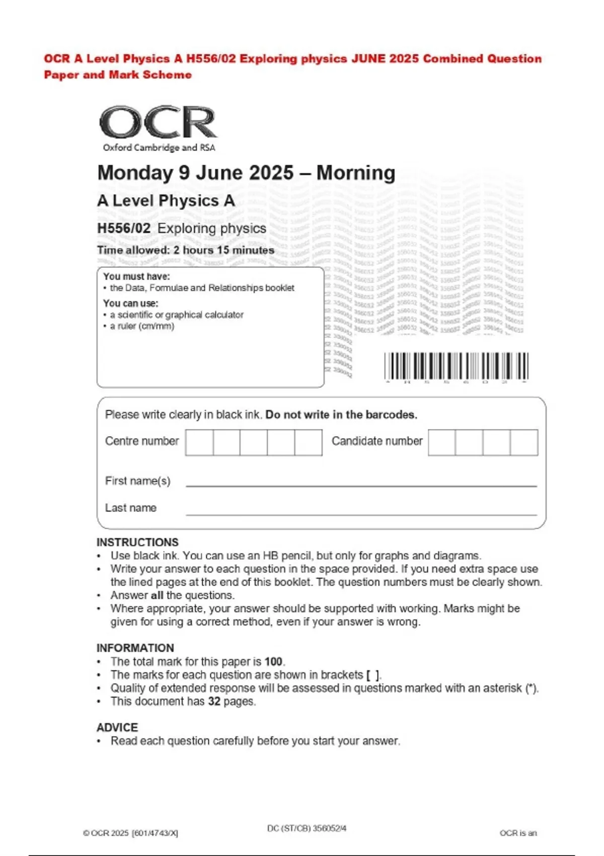 OCR A Level Physics A H556/02 Exploring physics JUNE 2025 Combined Question Paper and Mark Scheme