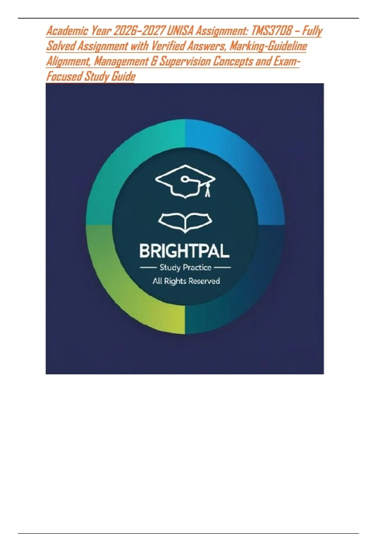 This Academic Year 2026–2027 UNISA TMS3708 assignment is a fully solved, marking-guideline-aligned study resource prepared in line with the latest UNISA syllabus and 2026 assessment standards. It covers key management and supervision concepts including leadership styles, workplace communication, planning and organizing, performance management, conflict resolution, and effective supervision practices. Presented with clearly structured, exam-ready answers, this resource supports accurate assignment submission, portfolio preparation, and exam revision, making it ideal for UNISA students seeking to strengthen managerial competence and achieve higher marks.