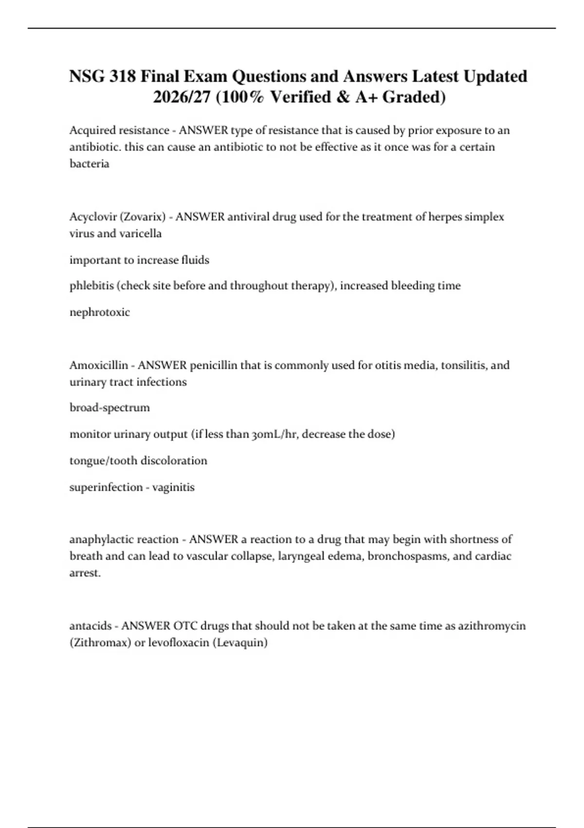 NSG 318 Final Exam Questions and Answers Latest Updated 2026/27 (100% Verified & A+ Graded)