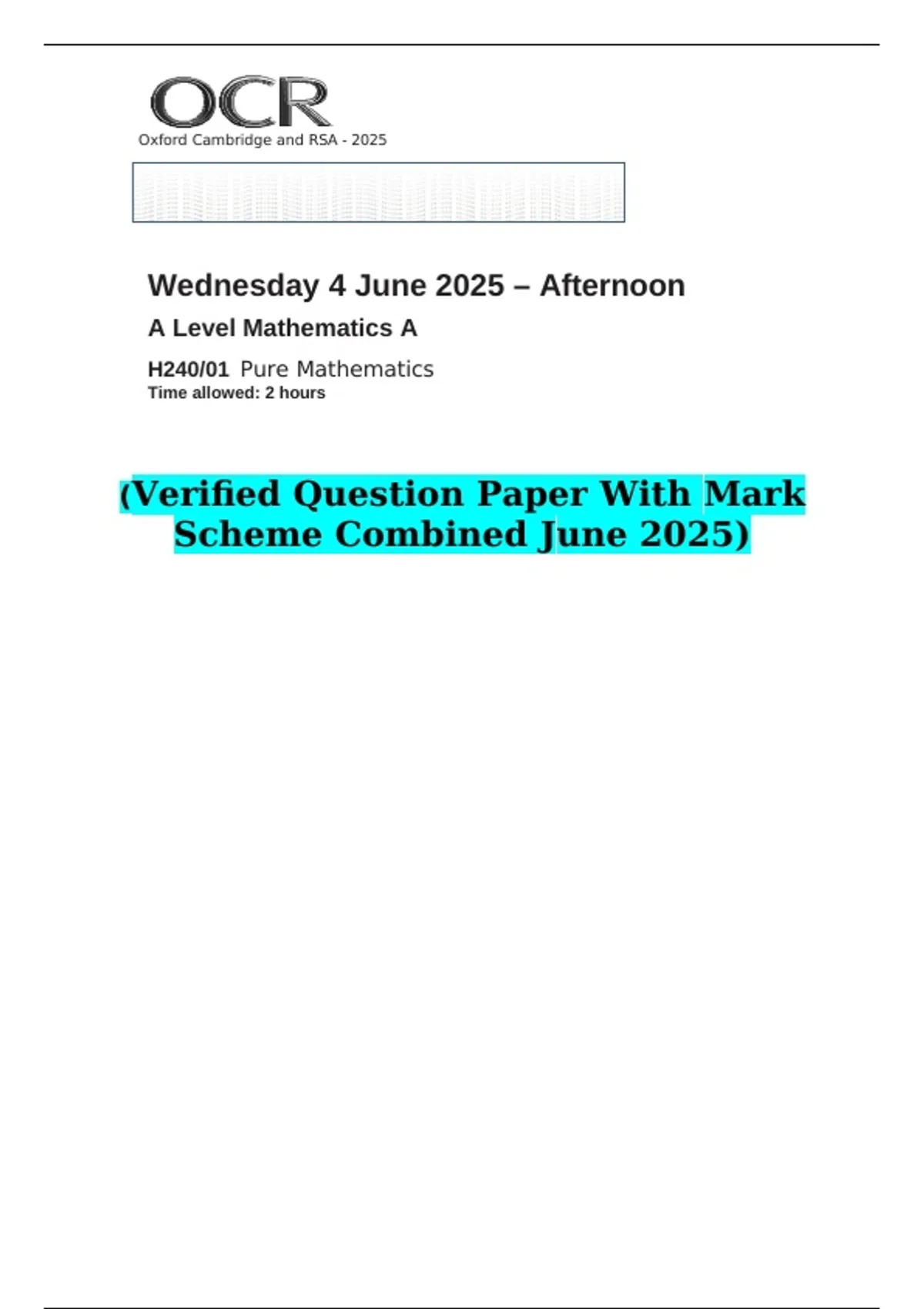 2025 A Level Mathematics A H240/01 Pure Mathematics (Verified Question Paper With Mark Scheme Combined June 2025)