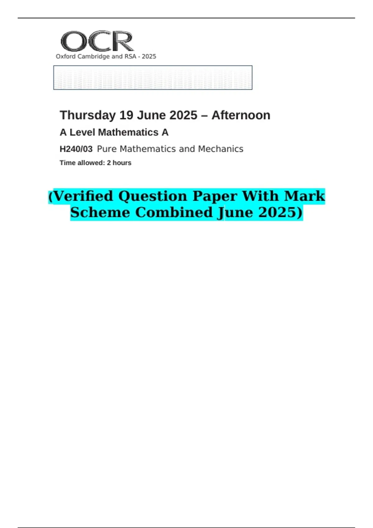 2025 A Level Mathematics A H240/03 Pure Mathematics and Mechanics (Verified Question Paper With Mark Scheme Combined June 2025)