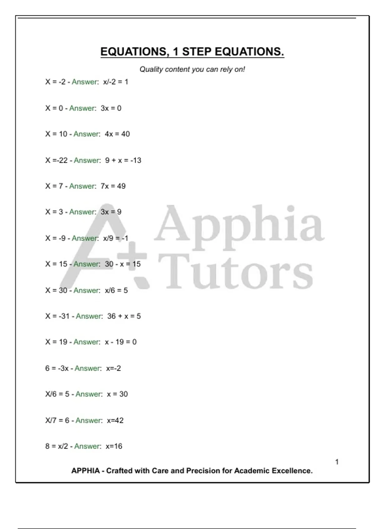 EQUATIONS, 1 STEP EQUATIONS. Quality content you can rely on!