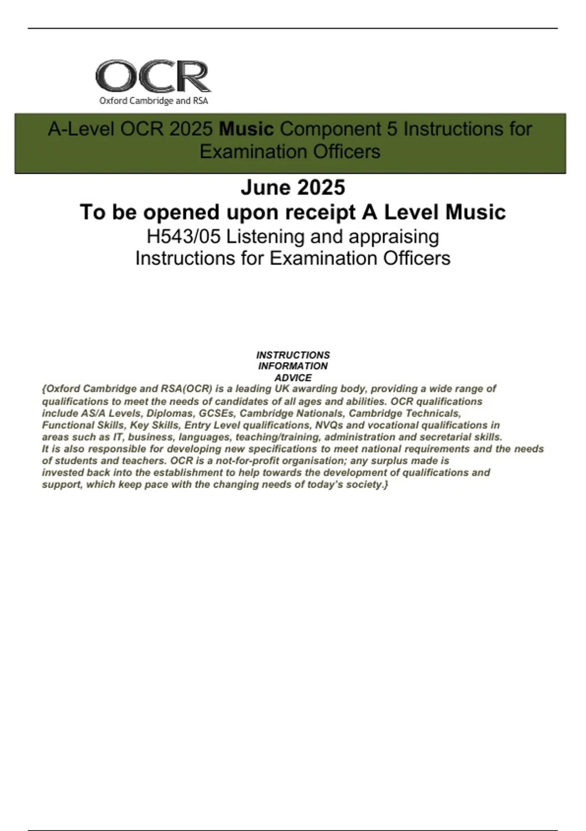 A-Level OCR 2025 Music Component 5 Instructions for Examination Officers