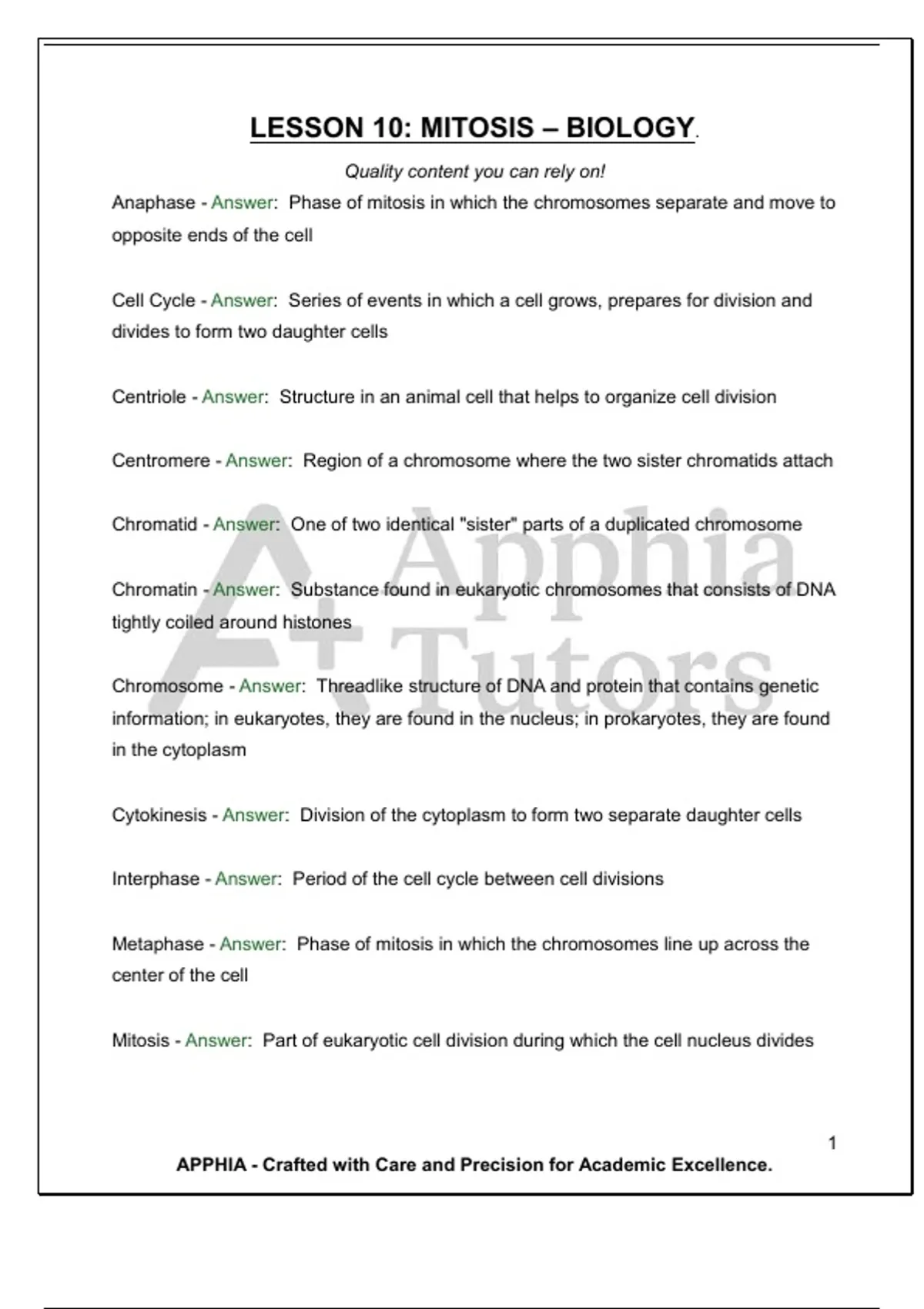Metaphase - Answer: Phase of mitosis in which the chromosomes line up across the