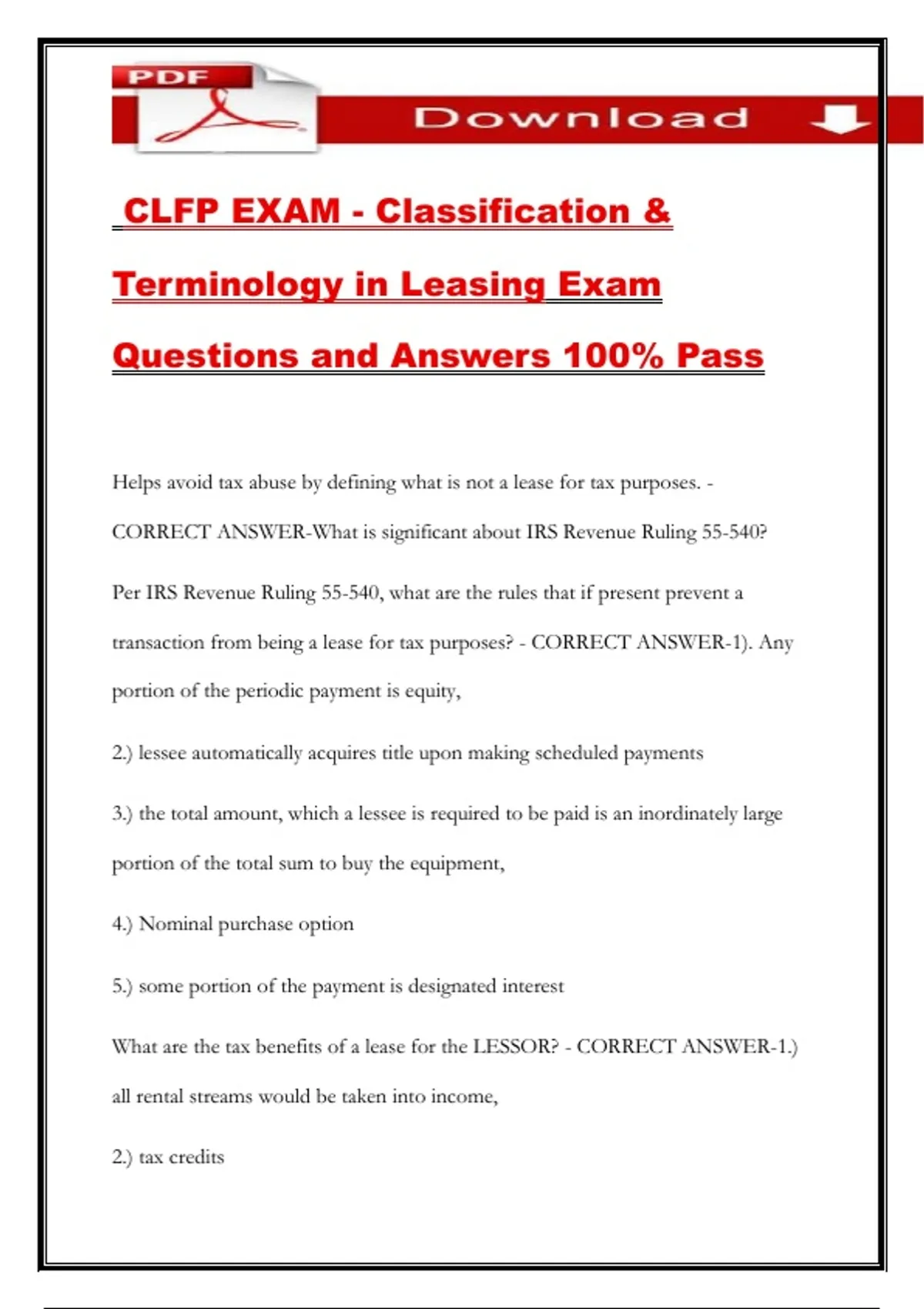 CLFP EXAM - Classification & Terminology in Leasing Exam Questions and Answers 100% Pass