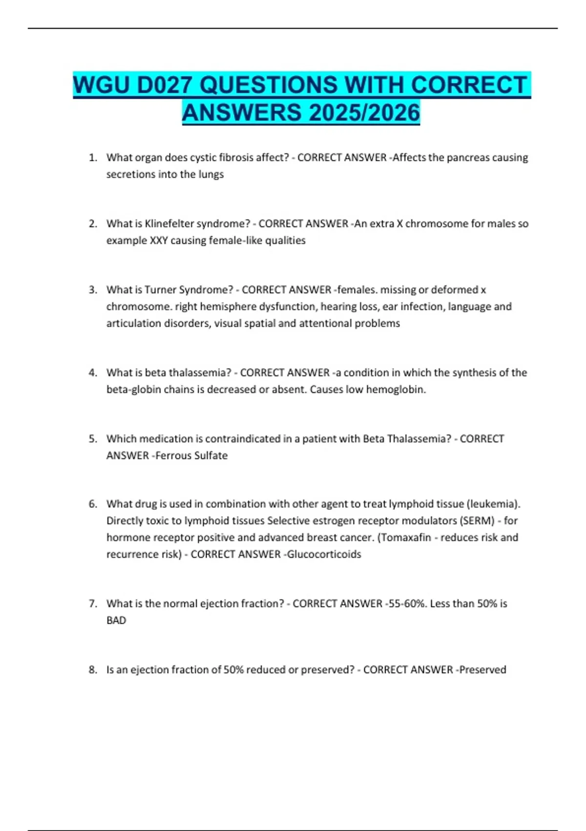 7. What is the normal ejection fraction? - CORRECT ANSWER -55-60%. Less than 50% is