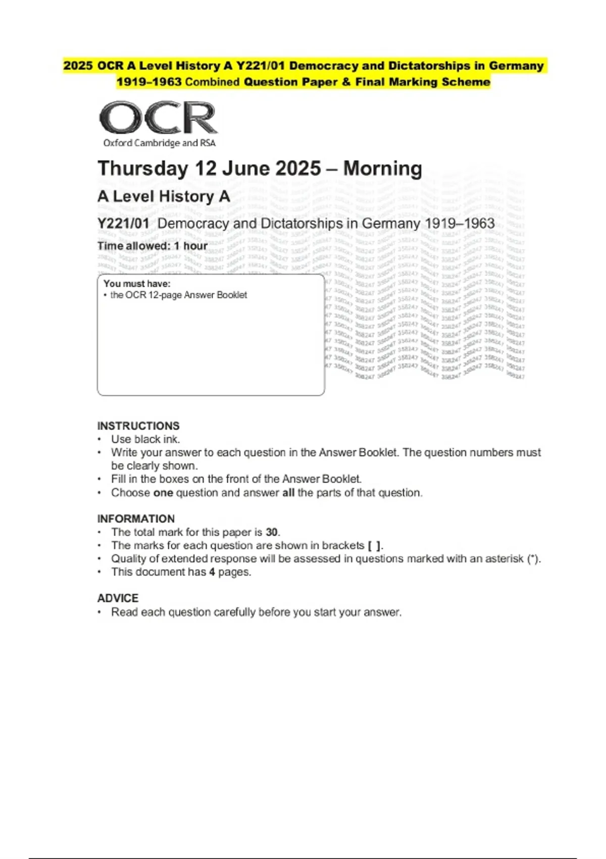 2025 OCR A Level History A Y221/01 Democracy and Dictatorships in Germany 1919–1963 Combined Question Paper and Marking Scheme