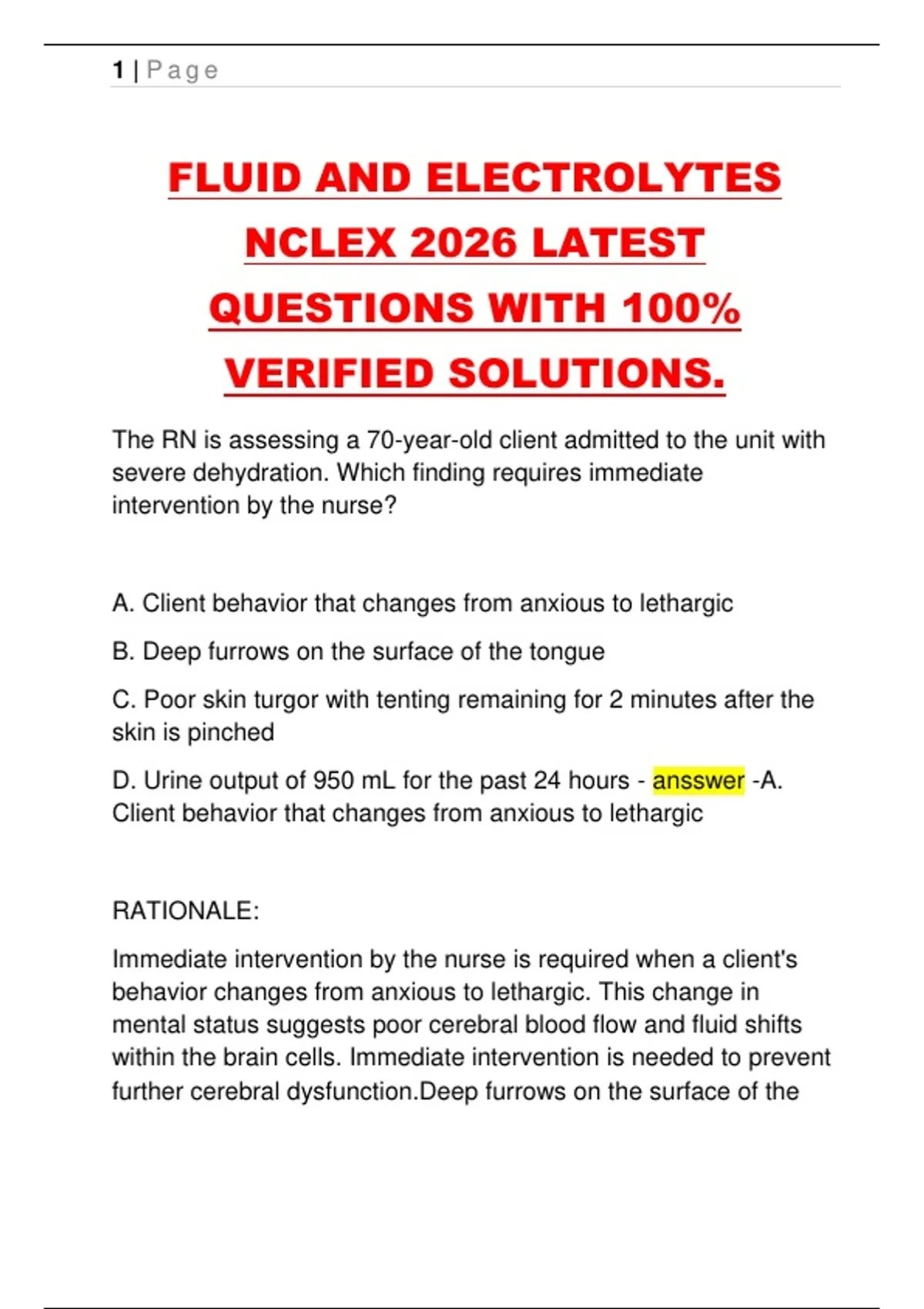 FLUID AND ELECTROLYTES NCLEX 2026 LATEST QUESTIONS WITH 100% VERIFIED SOLUTIONS.