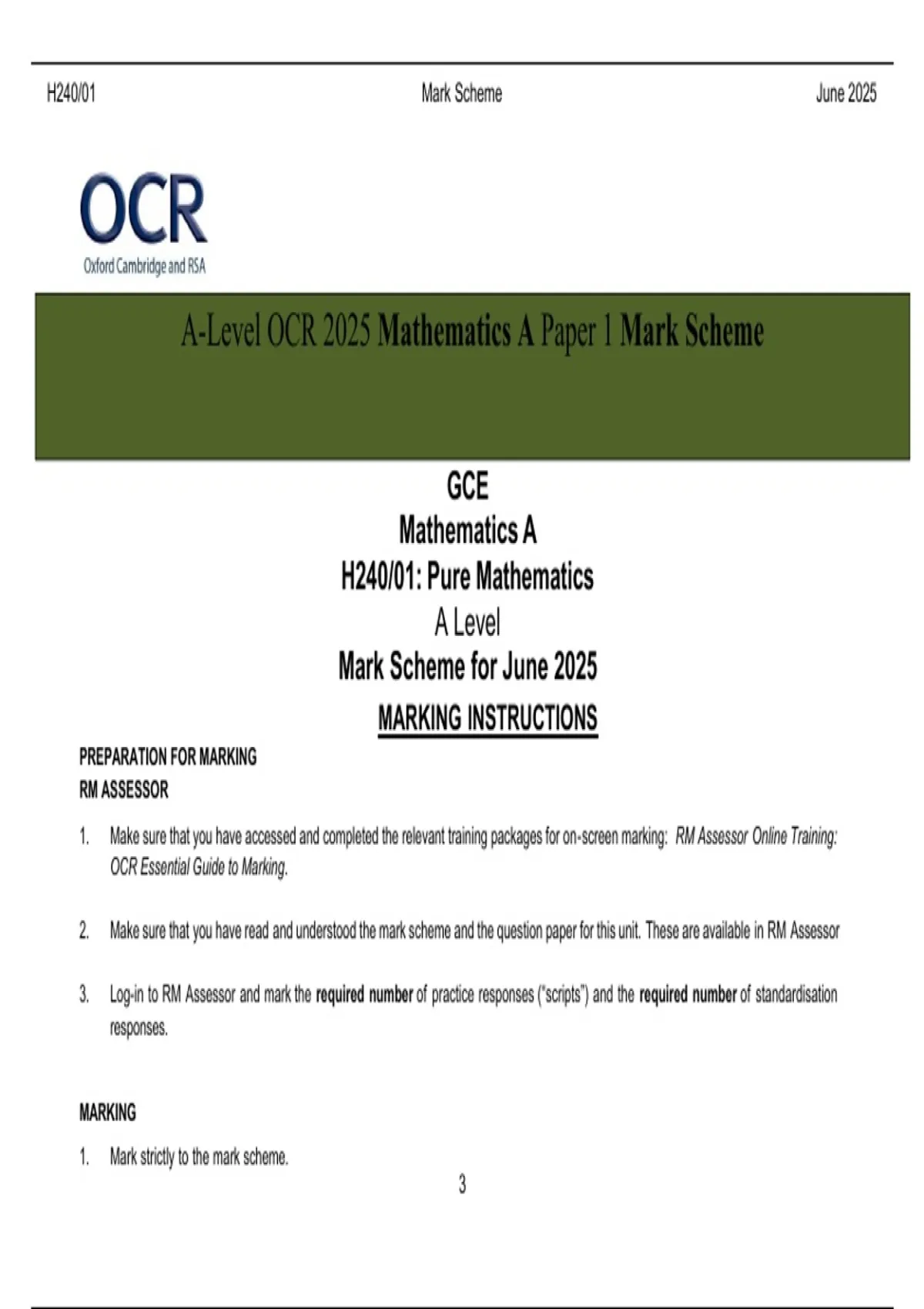A-Level OCR 2025 Mathematics A Paper 1 Mark Scheme