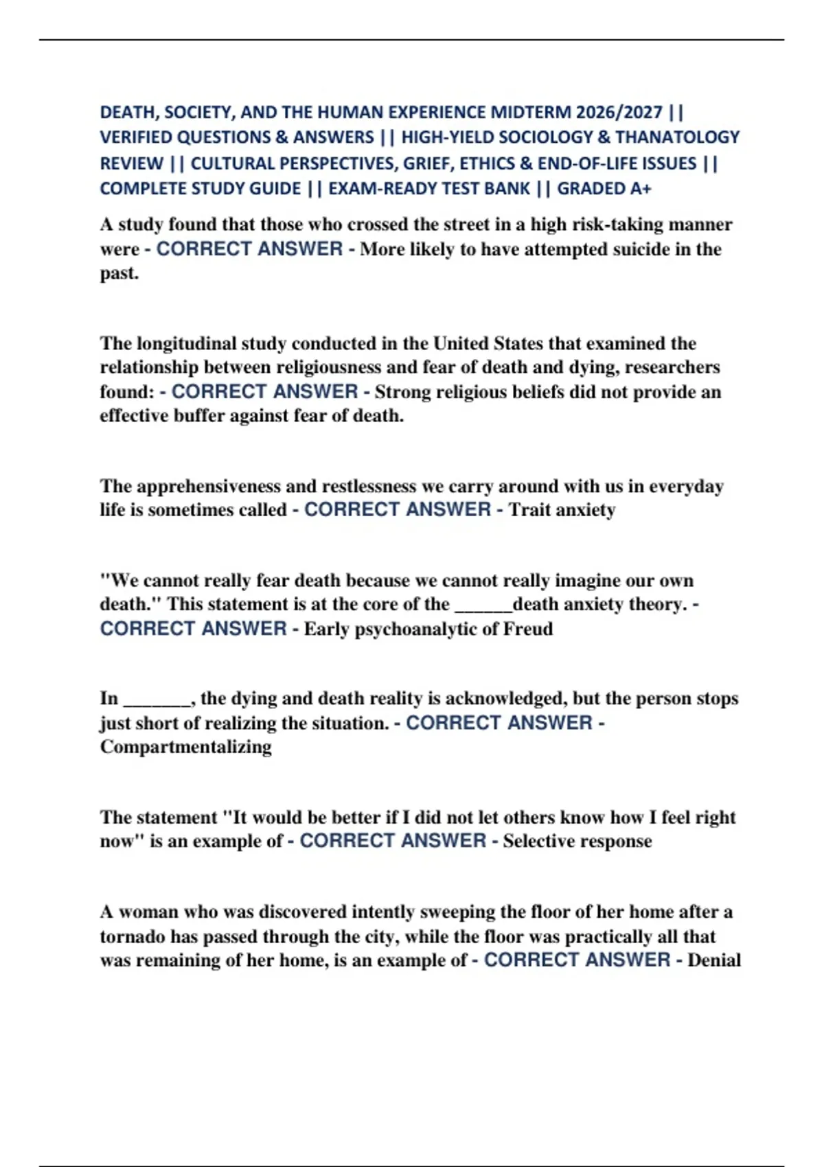 VERIFIED QUESTIONS & ANSWERS || HIGH-YIELD SOCIOLOGY & THANATOLOGY