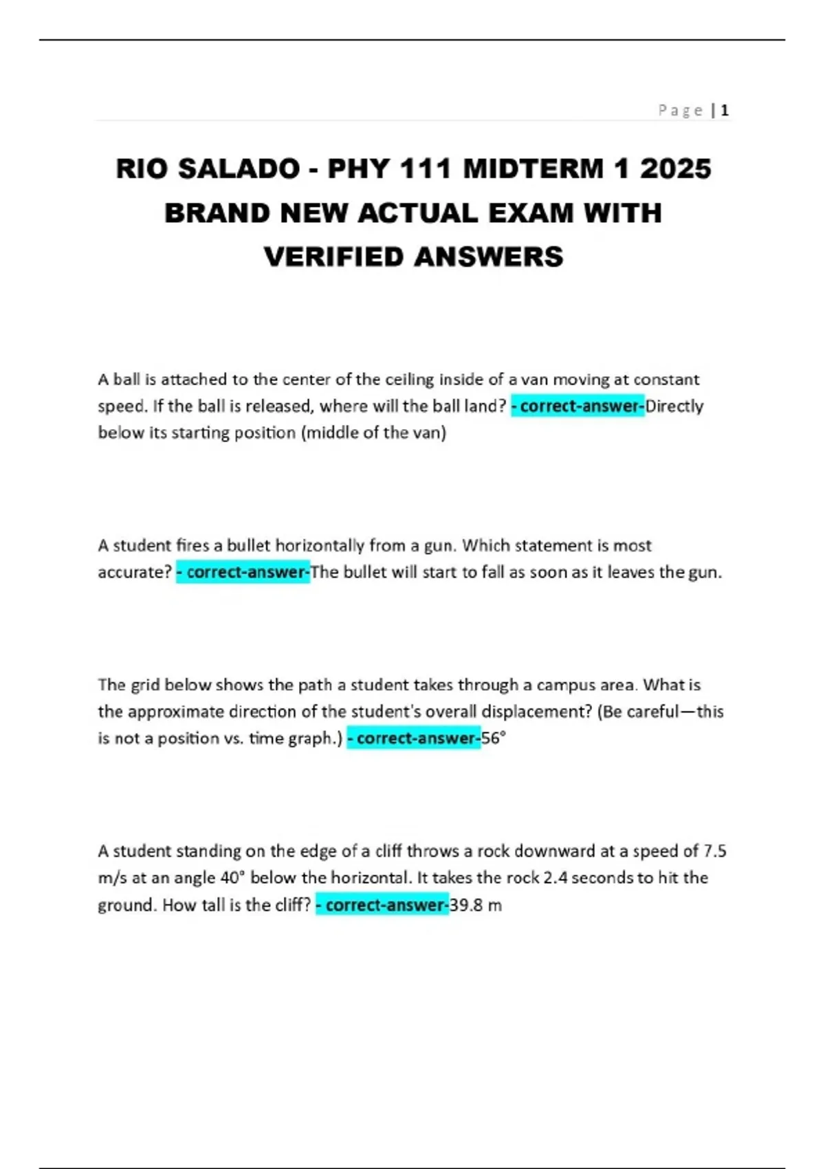 RIO Page 1 SALADO - PHY 111 MIDTERM 1 2025 | 2026 BRAND NEW ACTUAL EXAM WITH VERIFIED ANSWERS