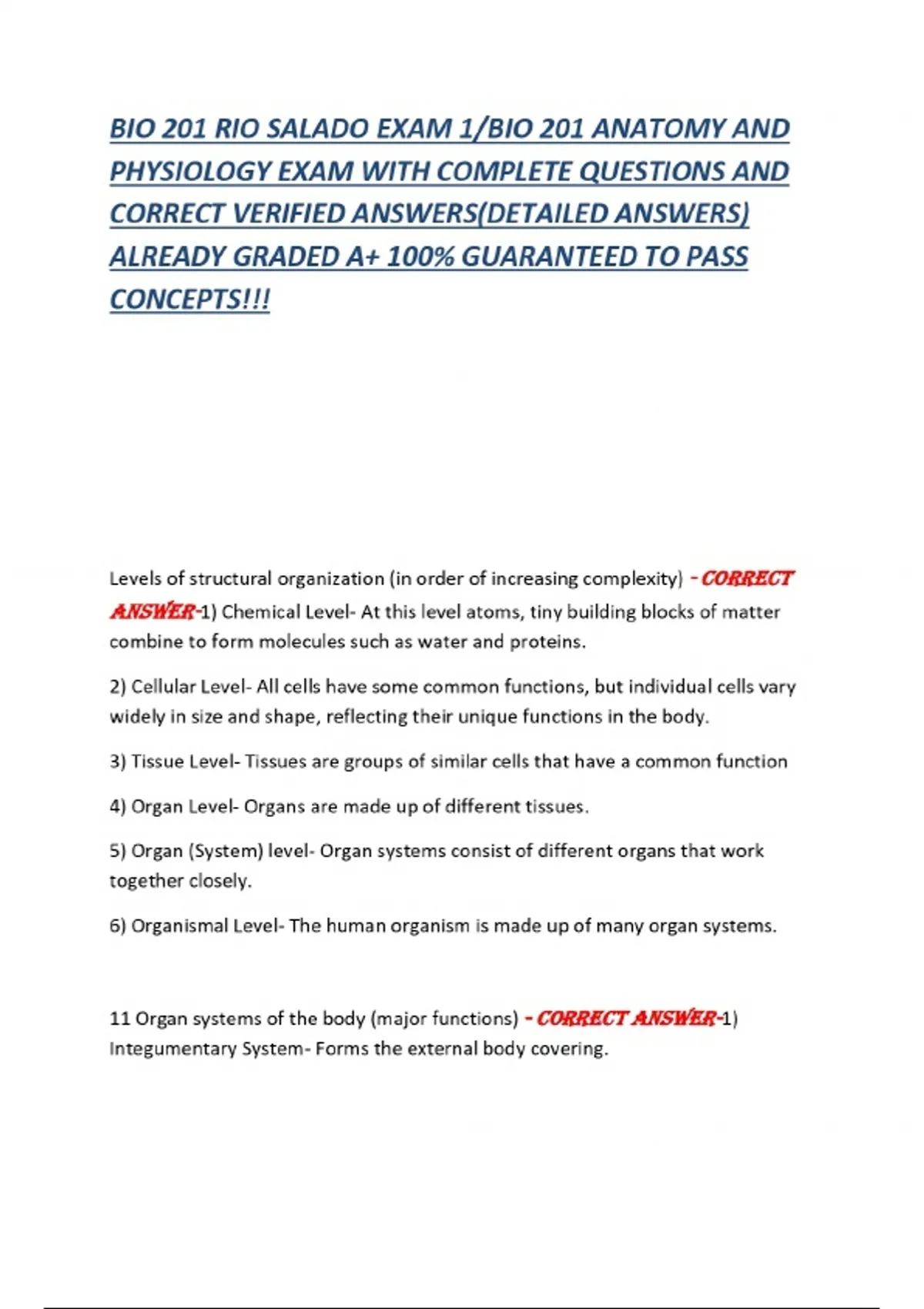 BIO 201 RIO SALADO EXAM 1/BIO 201 ANATOMY AND PHYSIOLOGY EXAM WITH COMPLETE QUESTIONS AND CORRECT VERIFIED ANSWERS(DETAILED ANSWERS) ALREADY GRADED A+ 100% GUARANTEED TO PASS CONCEPTS!!!