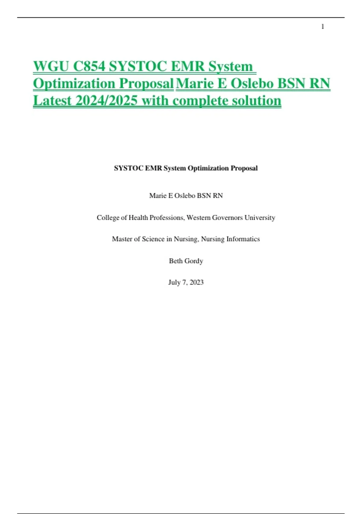 WGU C854 SYSTOC EMR System Optimization Proposal Marie E Oslebo BSN RN Latest 2024/2025 with complete solution