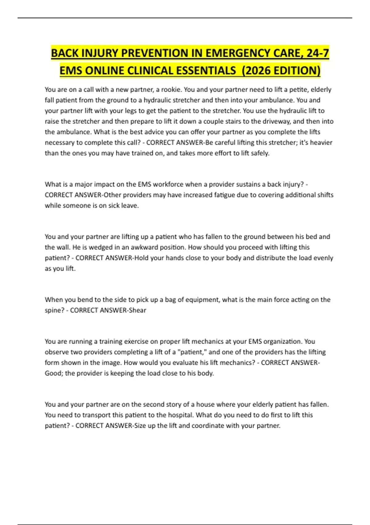 This document focuses on evidence-based strategies for preventing back injuries in emergency and prehospital care settings. It covers proper body mechanics, safe lifting and moving techniques, ergonomic considerations, and risk reduction for EMS and healthcare providers. Updated for 2026, the content supports clinical training, workplace safety, and exam preparation.