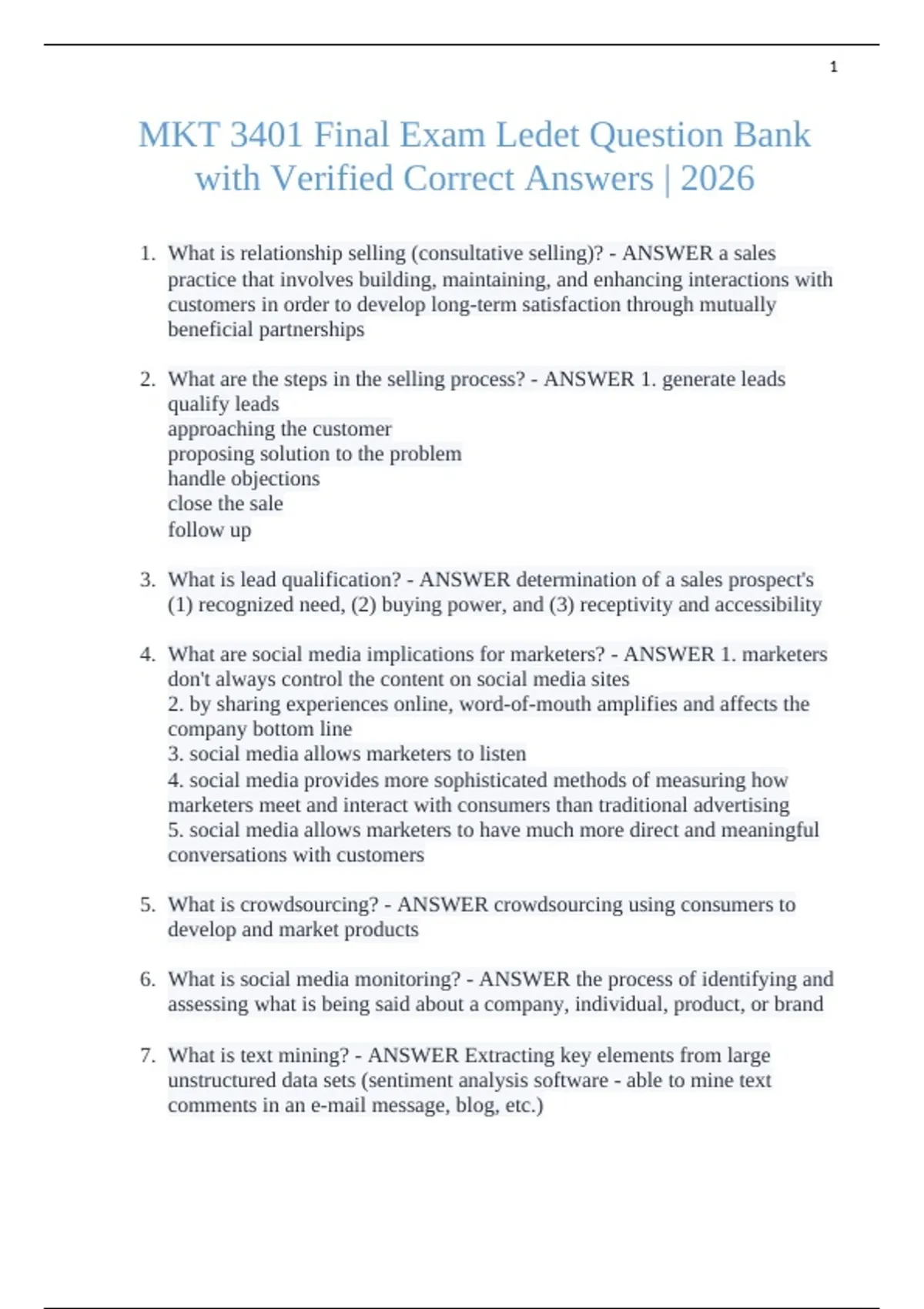 MKT 3401 Final Exam Ledet Question Bank with Verified Correct Answers | 2026 1. What is relationship selling (consultative selling)? - ANSWER a sales practice that involves building, maintaining, and enhancing interactions with customers in order to develop long-term satisfaction through mutually beneficial partnerships 2. What are the steps in the selling process? - ANSWER 1. generate leads qualify leads approaching the customer proposing solution to the problem handle objections close the sale follow up 3. What is lead qualification? - ANSWER determination of a sales prospect's (1) recognized need, (2) buying power, and (3) receptivity and accessibility 4. What are social media implications for marketers? - ANSWER 1. marketers don't always control the content on social media sites 2. by sharing experiences online, word-of-mouth amplifies and affects the company bottom line 3. social media allows marketers to listen 4. social media provides more sophisticated methods of measuring how marketers meet and interact with consumers than traditional advertising 5. social media allows marketers to have much more direct and meaningful conversations with customers 5. What is crowdsourcing? - ANSWER crowdsourcing using consumers to develop and market products 6. What is social media monitoring? - ANSWER the process of identifying and assessing what is being said about a company, individual, product, or brand 7. What is text mining? - ANSWER Extracting key elements from large unstructured data sets (sentiment analysis software - able to mine text comments in an e-mail message, blog, etc.) 8. What are the social media metrics? - ANSWER buzz, interest, participation, search engine ranks and results, influence, sentiment analysis, website metrics 9. What are the 6 categories of social media users? - ANSWER 1. Creators 2. Critics 3. Collectors 4. Joiners 5. Spectators 6. Inactives 10. What are the 6 components of a social media plan? - ANSWER 1. Listen to customers 2. set social media objectives 3. define strategies 4. identify the target audience 5. select the tools and platforms 6. implement and monitor the strategy 11. market - ANSWER a group of buyers and sellers of a particular good or service 12. market segment - ANSWER people or organizations with needs or wants and the ability and willingness to buy 13. Market Segmentation - ANSWER a subgroup of people or organizations sharing one or more characteristics that cause them to have similar product needs 14. What are the 4 basic criteria for a segmentation scheme to be successful? - ANSWER 1. Identifiable, 2. Accessibility, 3. Responsiveness, 4. Substantiality 15. What is identifiable? - ANSWER Companies need to gather the proper data in order to help identify their possible markets. This will give them info on the populations demographic, psychographic, geographic, and age of family members, marital status, and whether or not there are children 16. What is accessibility? - ANSWER members of targeted segments must be reachable with marketing mix 17. What is responsiveness? - ANSWER when the message being communicated to them is done in a way that hits a responsive chord with the customer 18. What is sustainability? - ANSWER customers make a financial difference on the company and justifies the company's financial resources and commitment 19. What are the 5 basis for segmenting consumer markets? - ANSWER Demographic, psychographic, geographic, benefit, and usage-rate 20. What is the 80/20 principle? - ANSWER a principle holding that 20 percent of all customers generate 80 percent of the demand 21. What are the 3 general strategies for selecting target markets? - ANSWER Undifferentiated, multi-segmented, and niche 22. undifferentiated targeting strategy - ANSWER a marketing approach that views the market as one big market with no individual segments and thus uses a single marketing mix 23. multi-segment targeting strategy - ANSWER a strategy that chooses two or more well-defined market segments and develops a distinct marketing mix for each 24. niche target market strategy - ANSWER concentrate on one marketing segment 25. What are the different positioning bases? - ANSWER attributes, price, and communication of value 26. attributes - ANSWER how a product or brand will be viewed or perceived by the customer 27. price - ANSWER decision regarding how to price a product is important to the overall brand and perception of the product