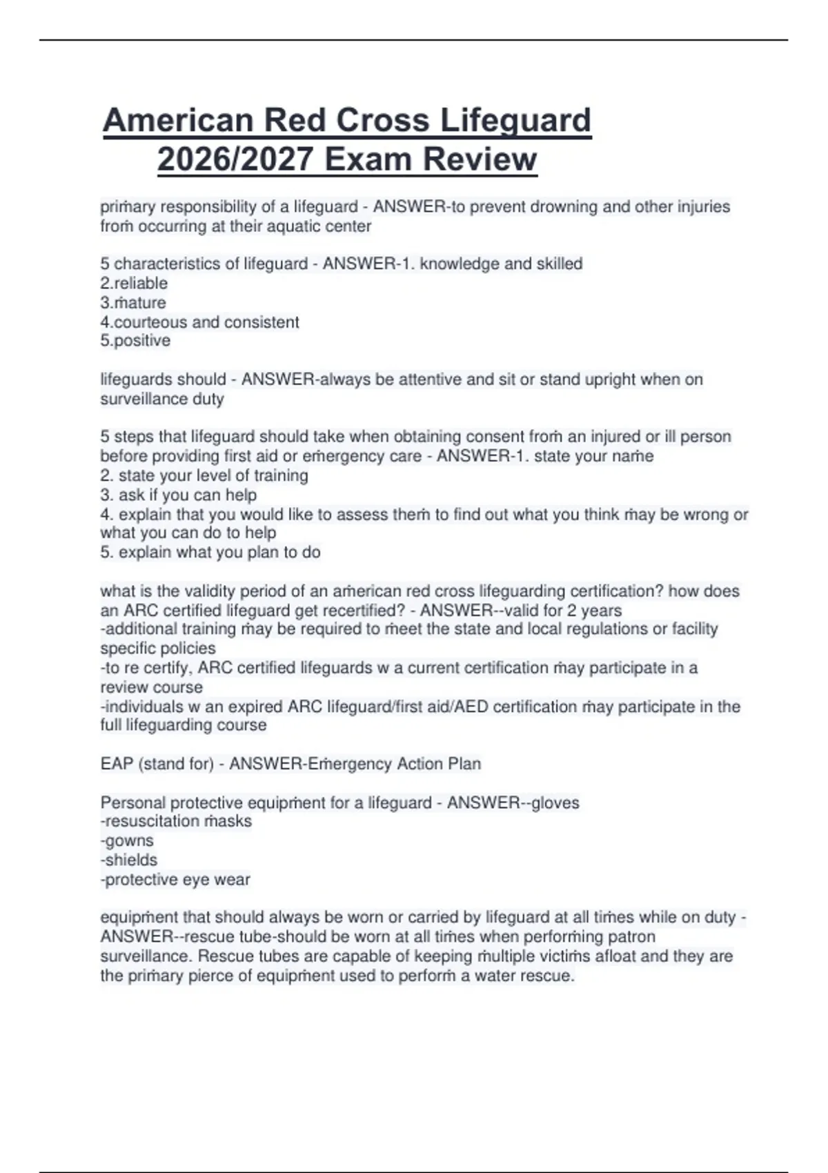 This exam review document summarizes the key knowledge and skills required for the American Red Cross Lifeguarding certification exam. It reviews core topics such as surveillance and prevention, water rescue techniques, emergency action plans, CPR, AED use, and first aid to support effective exam revision for the 2026/2027 certification cycle.