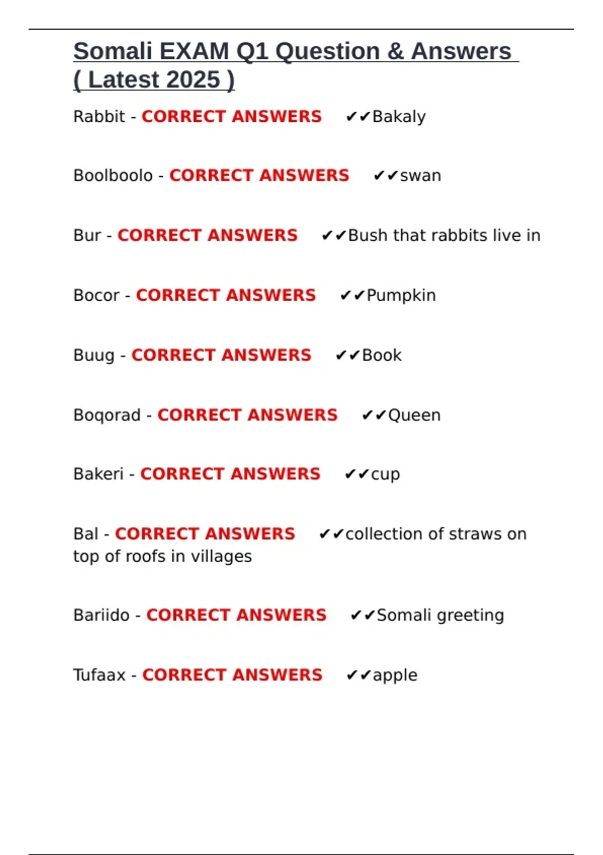 , Somali EXAM Q1 Question & Answers