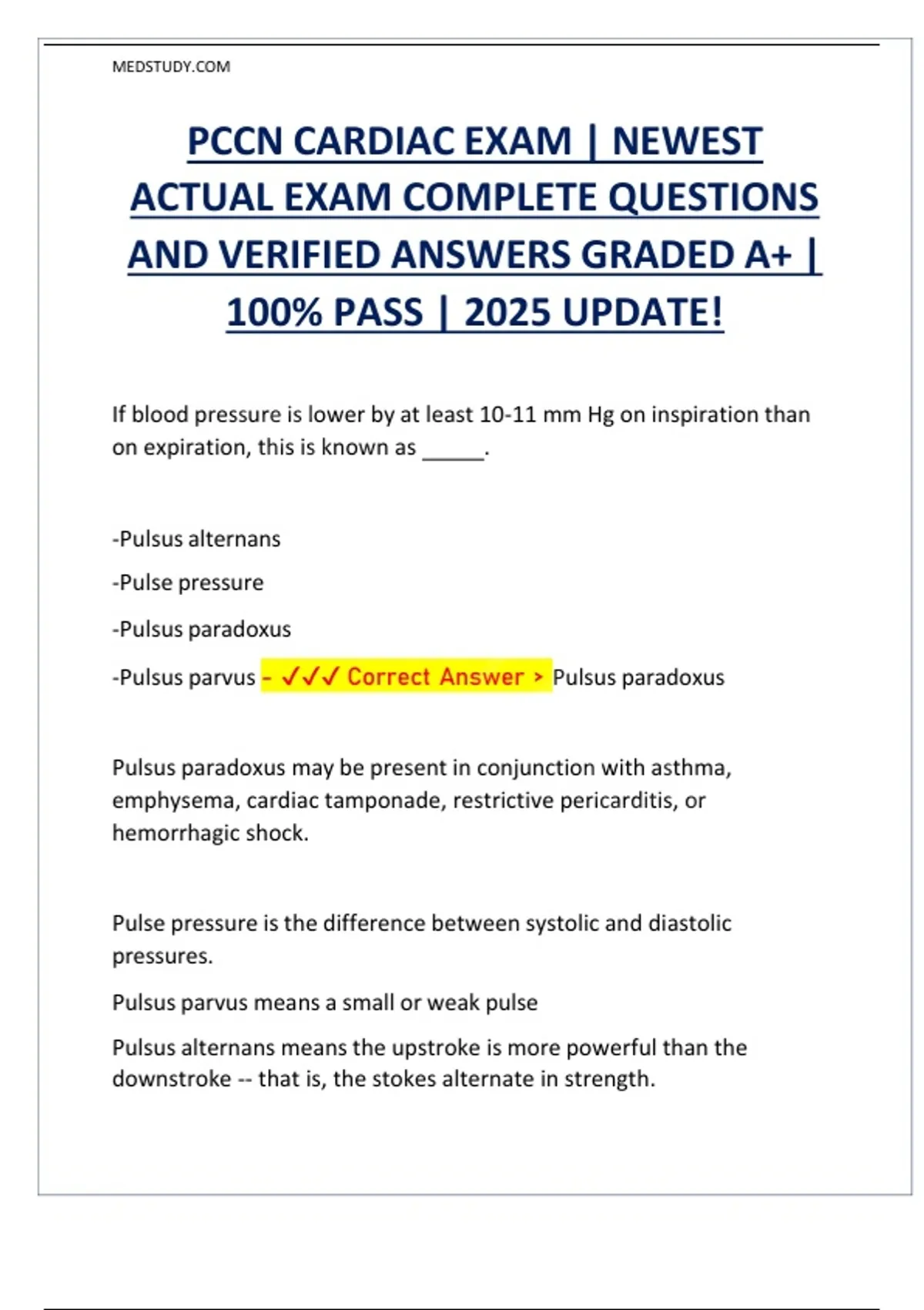 -Pulsus parvus - ✔✔✔ Correct Answer > Pulsus paradoxus