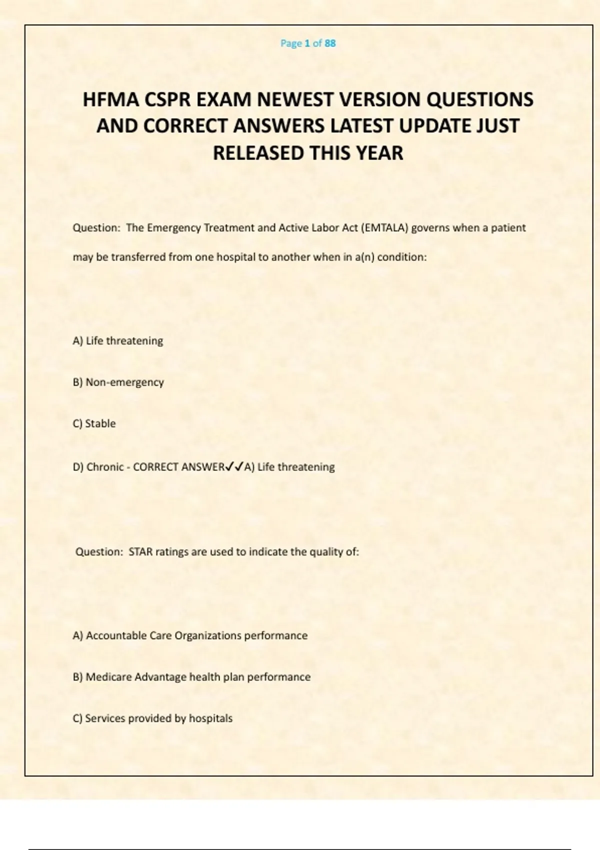 HFMA CSPR EXAM NEWEST VERSION QUESTIONS AND CORRECT ANSWERS LATEST UPDATE JUST RELEASED THIS YEAR