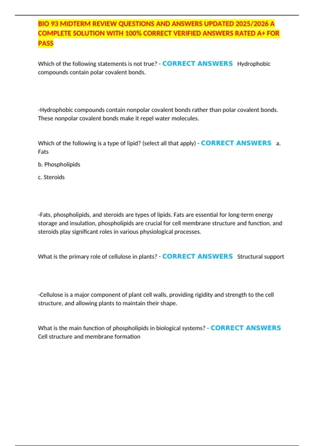 BIO 93 MIDTERM REVIEW QUESTIONS AND ANSWERS UPDATED 2025/2026 A