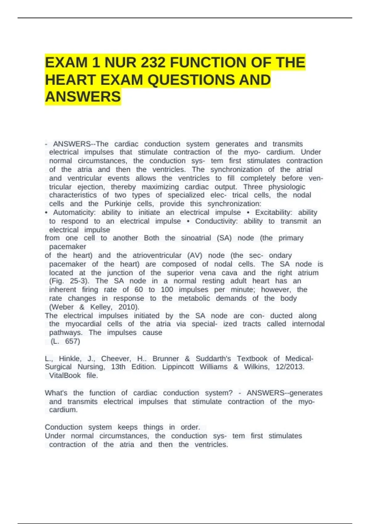 EXAM 1 NUR 232 FUNCTION OF THE HEART EXAM QUESTIONS AND ANSWERS