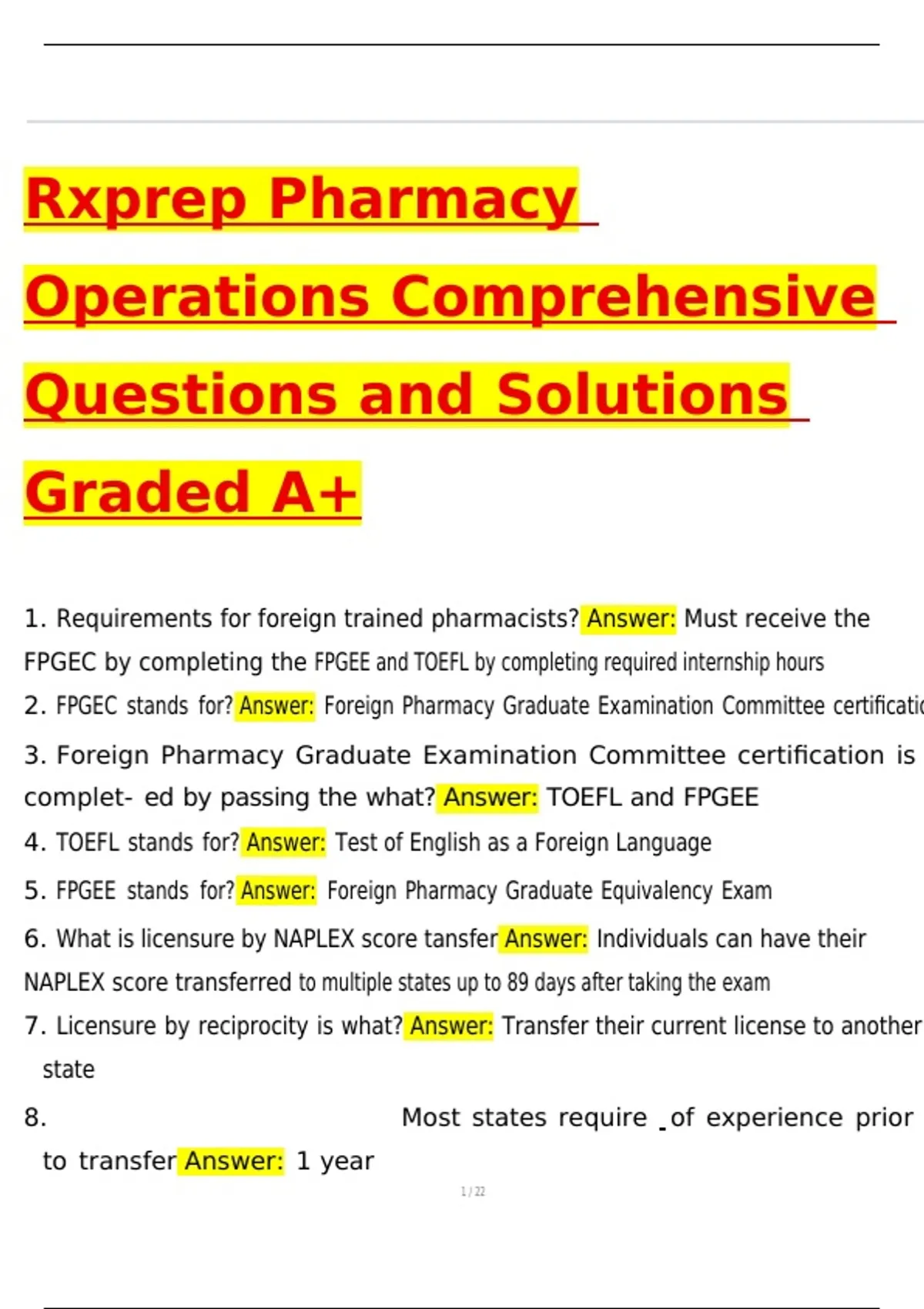 1. Requirements for foreign trained pharmacists? Answer: Must receive the