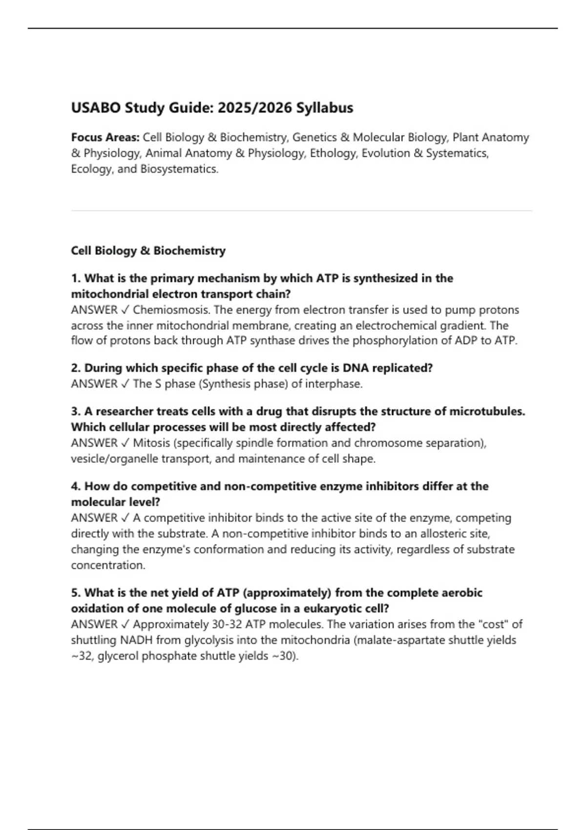 USABO Study Guide: 2025/2026 Syllabus Focus Areas: Cell Biology & Biochemistry, Genetics & Molecular Biology, Plant Anatomy & Physiology, Animal Anatomy & Physiology, Ethology, Evolution & Systematics, Ecology, and Biosystematics. Cell Biology & Biochemistry 1. What is the primary mechanism by which ATP is synthesized in the mitochondrial electron transport chain? ANSWER Chemiosmosis. The energy from electron transfer is used to pump protons across the inner mitochondrial membrane, creating an electrochemical gradient. The flow of protons back through ATP synthase drives the phosphorylation of ADP to ATP. 2. During which specific phase of the cell cycle is DNA replicated? ANSWER The S phase (Synthesis phase) of interphase. 3. A researcher treats cells with a drug that disrupts the structure of microtubules. Which cellular processes will be most directly affected? ANSWER Mitosis (specifically spindle formation and chromosome separation), vesicle/organelle transport, and maintenance of cell shape. 4. How do competitive and non-competitive enzyme inhibitors differ at the molecular level? ANSWER A competitive inhibitor binds to the active site of the enzyme, competing directly with the substrate. A non-competitive inhibitor binds to an allosteric site, changing the enzyme's conformation and reducing its activity, regardless of substrate concentration. 5. What is the net yield of ATP (approximately) from the complete aerobic oxidation of one molecule of glucose in a eukaryotic cell? ANSWER Approximately 30-32 ATP molecules. The variation arises from the "cost" of shuttling NADH from glycolysis into the mitochondria (malate-aspartate shuttle yields ~32, glycerol phosphate shuttle yields ~30). 6. What is the primary function of the Golgi apparatus? ANSWER Modification, sorting, and packaging of proteins and lipids for secretion or delivery to other organelles. 7. What is the role of chaperone proteins like HSP70? ANSWER They assist in the proper folding of nascent polypeptide chains and the refolding of misfolded proteins, often using ATP. 8. Describe the signal hypothesis for the targeting of proteins to the endoplasmic reticulum. ANSWER Proteins destined for the ER, secretion, or membranes have an N-terminal signal peptide. This peptide is recognized by a Signal Recognition Particle (SRP), which pauses translation and docks the ribosome complex onto an SRP receptor on the ER membrane. Translation then resumes, and the polypeptide is translocated into the ER lumen. 9. Why is the fluidity of the cell membrane critical for function? ANSWER It allows for membrane protein movement, proper membrane assembly, vesicle formation, and cell division. Fluidity is modulated by cholesterol and the saturation of fatty acid tails. 10. What is the fundamental difference between prokaryotic and eukaryotic ribosomes? ANSWER Prokaryotic ribosomes are 70S (composed of 50S and 30S subunits), while eukaryotic ribosomes are 80S (composed of 60S and 40S subunits). This difference is the basis for many antibiotics. Genetics & Molecular Biology 11. A woman is heterozygous for an autosomal dominant disorder (Aa). She has a child with an unaffected man (aa). What is the probability their child will be affected? ANSWER 50%. The cross is Aa x aa. The possible genotypes are Aa (affected) and aa (unaffected), each with a 1/2 probability. 12. In a dihybrid cross (AaBb x AaBb) with independent assortment, what is the expected phenotypic ratio? ANSWER 9:3:3:1. 13. What is the central dogma of molecular biology? ANSWER DNA is transcribed into RNA, which is translated into protein. Information flow is DNA → RNA → Protein. 14. What is the function of DNA ligase in DNA replication? ANSWER It catalyzes the formation of a phosphodiester bond between the 3'-OH of one Okazaki fragment and the 5' phosphate of the next, sealing nicks in the sugarphosphate backbone.