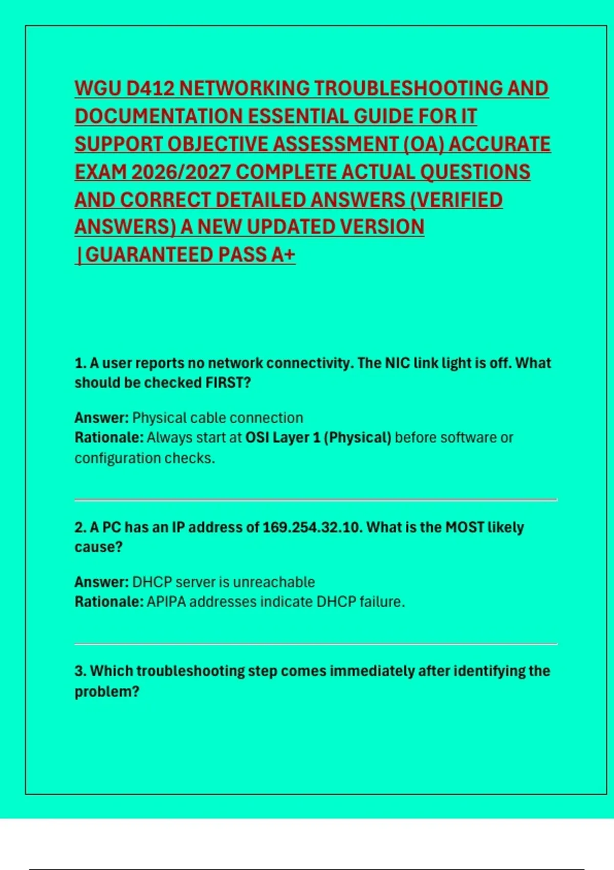 WGU D412 NETWORKING TROUBLESHOOTING AND DOCUMENTATION ESSENTIAL GUIDE FOR IT SUPPORT OBJECTIVE ASSESSMENT (OA) ACCURATE EXAM 2026/2027 COMPLETE ACTUAL QUESTIONS AND CORRECT DETAILED ANSWERS (VERIFIED ANSWERS) A NEW UPDATED VERSION |GUARANTEED PASS A+