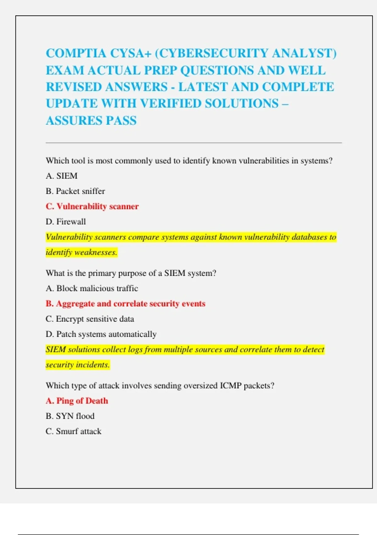 COMPTIA CYSA+ (CYBERSECURITY ANALYST) EXAM ACTUAL PREP QUESTIONS AND WELL REVISED ANSWERS - LATEST AND COMPLETE UPDATE WITH VERIFIED SOLUTIONS – ASSURES PASS