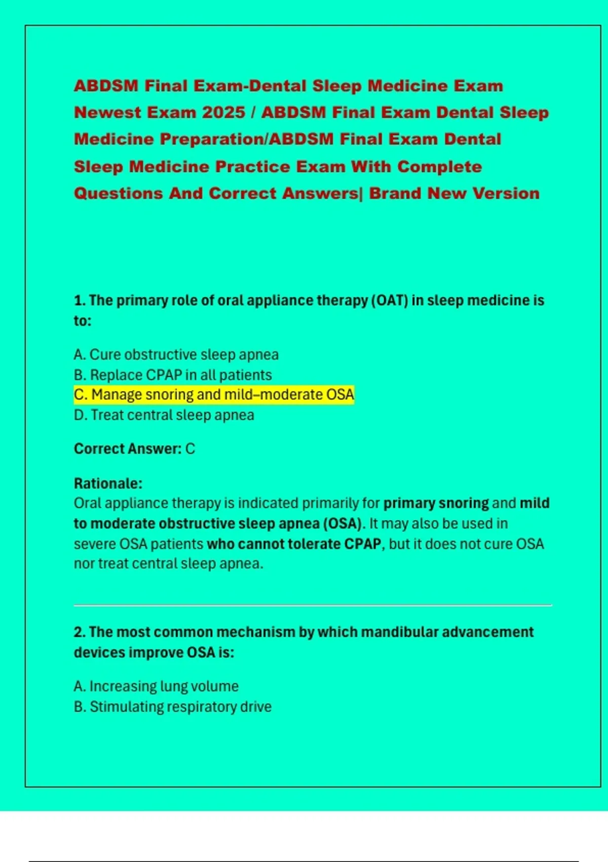 Newest Exam 2025 / ABDSM Final Exam Dental Sleep