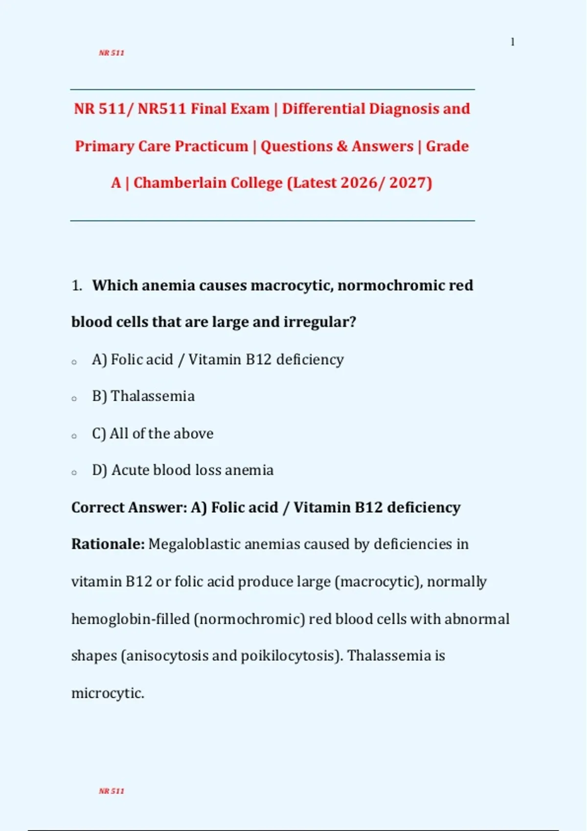 NR 511/ NR511 Final Exam | Differential Diagnosis and