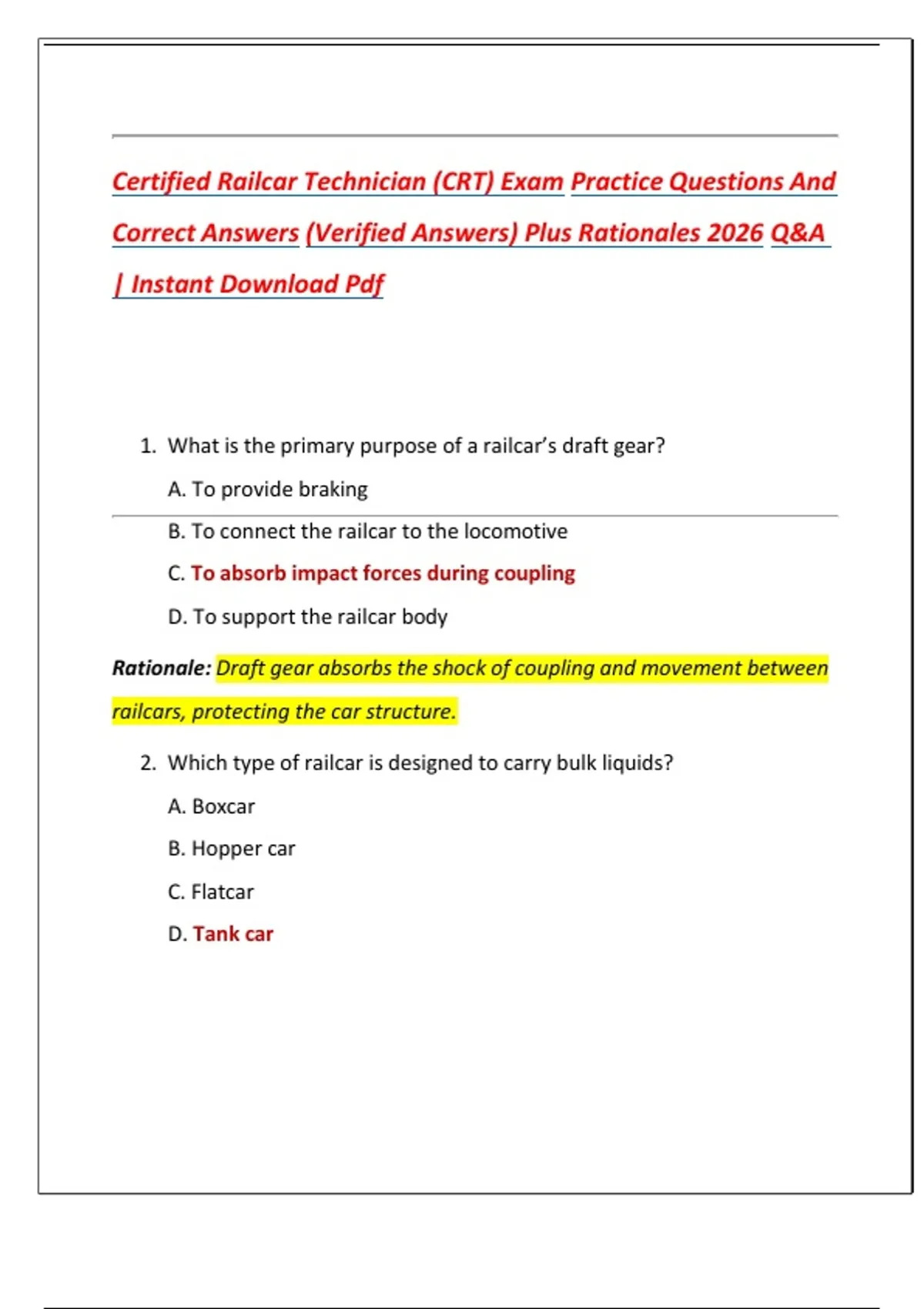 Certified Railcar Technician (CRT) Exam Practice Questions And Correct Answers (Verified Answers) Plus Rationales 2026 Q&A | Instant Download Pdf