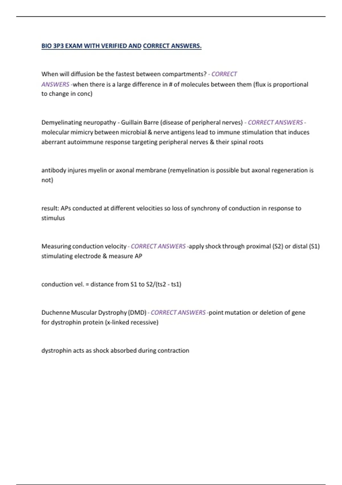 When will diffusion be the fastest between compartments? - CORRECT ANSWERS -when there is a large difference in # of molecules between them (flux is proportional to change in conc) Demyelinating neuropathy - Guillain Barre (disease of peripheral nerves) - CORRECT ANSWERS -molecular mimicry between microbial & nerve antigens lead to immune stimulation that induces aberrant autoimmune response targeting peripheral nerves & their spinal roots antibody injures myelin or axonal membrane (remyelination is possible but axonal regeneration is not) result: APs conducted at different velocities so loss of synchrony of conduction in response to stimulus Measuring conduction velocity - CORRECT ANSWERS -apply shock through proximal (S2) or distal (S1) stimulating electrode & measure AP conduction vel. = distance from S1 to S2/(ts2 - ts1) Duchenne Muscular Dystrophy (DMD) - CORRECT ANSWERS -point mutation or deletion of gene for dystrophin protein (x-linked recessive) dystrophin acts as shock absorbed during contraction