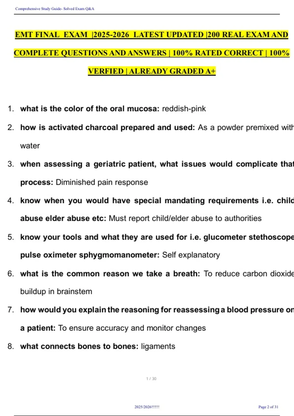 EMT FINAL EXAM |2025-2026 LATEST UPDATED |200 REAL EXAM AND