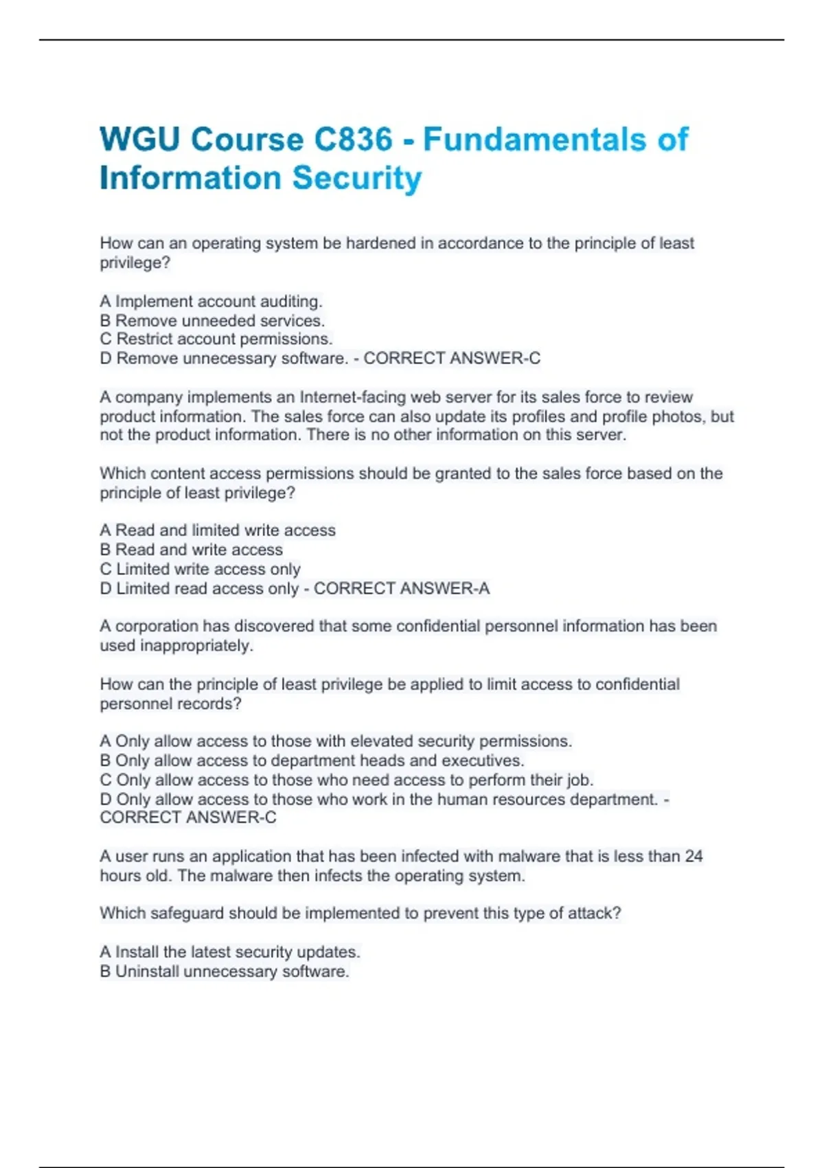 How can an operating system be hardened in accordance to the principle of least privilege? A Implement account auditing. B Remove unneeded services. C Restrict account permissions. D Remove unnecessary software. - CORRECT ANSWER-C A company implements an Internet-facing web server for its sales force to review product information. The sales force can also update its profiles and profile photos, but not the product information. There is no other information on this server. Which content access permissions should be granted to the sales force based on the principle of least privilege? A Read and limited write access B Read and write access C Limited write access only D Limited read access only - CORRECT ANSWER-A A corporation has discovered that some confidential personnel information has been used inappropriately. How can the principle of least privilege be applied to limit access to confidential personnel records? A Only allow access to those with elevated security permissions. B Only allow access to department heads and executives. C Only allow access to those who need access to perform their job. D Only allow access to those who work in the human resources department. - CORRECT ANSWER-C A user runs an application that has been infected with malware that is less than 24 hours old. The malware then infects the operating system. Which safeguard should be implemented to prevent this type of attack? A Install the latest security updates. B Uninstall unnecessary software.C Modify the default user accounts. D Limit user account privileges. - CORRECT ANSWER-D A company was the victim of a security breach resulting in stolen user credentials. An attacker used a stolen username and password to log in to an employee email account. Which security practice could have reduced the post-breach impact of this event? A Multi-factor authentication B Operating system hardening C Network segmentation D Mutual authentication - CORRECT ANSWER-A A module in a security awareness course shows a user making use of two-factor authentication using a hardware token. A malicious hacker was successful in a denial of service (DoS) attack against an institution's mail server. Fortunately, no data was lost or altered while the server was offline. Which type of attack is this? A Modification B Fabrication C Interception D Interruption - CORRECT ANSWER-D