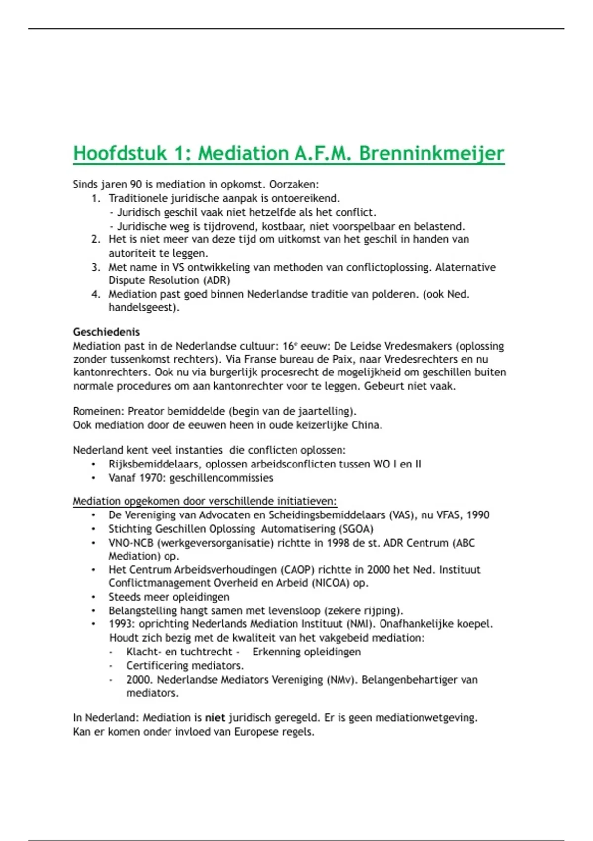 Hoofdstuk 1: Mediation A.F.M. Brenninkmeijer Sinds jaren 90 is mediation in opkomst. Oorzaken: 1. Traditionele juridische aanpak is ontoereikend. - Juridisch geschil vaak niet hetzelfde als het conflict. - Juridische weg is tijdrovend, kostbaar, niet voorspelbaar en belastend. 2. Het is niet meer van deze tijd om uitkomst van het geschil in handen van autoriteit te leggen. 3. Met name in VS ontwikkeling van methoden van conflictoplossing. Alaternative Dispute Resolution (ADR) 4. Mediation past goed binnen Nederlandse traditie van polderen. (ook Ned. handelsgeest). Geschiedenis Mediation past in de Nederlandse cultuur: 16e eeuw: De Leidse Vredesmakers (oplossing zonder tussenkomst rechters). Via Franse bureau de Paix, naar Vredesrechters en nu kantonrechters. Ook nu via burgerlijk procesrecht de mogelijkheid om geschillen buiten normale procedures om aan kantonrechter voor te leggen. Gebeurt niet vaak. Romeinen: Preator bemiddelde (begin van de jaartelling). Ook mediation door de eeuwen heen in oude keizerlijke China. Nederland kent veel instanties die conflicten oplossen: • Rijksbemiddelaars, oplossen arbeidsconflicten tussen WO I en II • Vanaf 1970: geschillencommissies Mediation opgekomen door verschillende initiatieven: • De Vereniging van Advocaten en Scheidingsbemiddelaars (VAS), nu VFAS, 1990 • Stichting Geschillen Oplossing Automatisering (SGOA) • VNO-NCB (werkgeversorganisatie) richtte in 1998 de st. ADR Centrum (ABC Mediation) op. • Het Centrum Arbeidsverhoudingen (CAOP) richtte in 2000 het Ned. Instituut Conflictmanagement Overheid en Arbeid (NICOA) op. • Steeds meer opleidingen • Belangstelling hangt samen met levensloop (zekere rijping). • 1993: oprichting Nederlands Mediation Instituut (NMI). Onafhankelijke koepel. Houdt zich bezig met de kwaliteit van het vakgebeid mediation: - Klacht- en tuchtrecht - Erkenning opleidingen - Certificering mediators. - 2000. Nederlandse Mediators Vereniging (NMv). Belangenbehartiger van mediators. In Nederland: Mediation is niet juridisch geregeld. Er is geen mediationwetgeving. Kan er komen onder invloed van Europese regels. 2002: Groenboek van de Europese Commissie. Dit vormt de voorbereiding voor een Europese richtlijn. Ook wordt gewerkt aan een Europese gedragscode voor mediators. 2008: Europees parlement en Raad van de Europese Unie: vaststelling Richtlijn Mediation. Doel: - vergemakkelijken toegang tot alternatieve geschillenbeslechting - bevorderen van de minnelijke schikking van geschillendoor: mediation/bemiddeling aan te moedigen en te zorgen voor evenwichtige samenhang tussen bemiddeling/mediation en behandeling in rechte. Jaren 90: minister van Justitie stimuleert mediation. 1996: internationale conferentie in Amsterdam. (aanwezigheid veel internationale deskundigen zorgde voor impuls). Platform ADR bracht in 1998 rapport uit over randvoorwaarden voor de introductie van mediation. : beleidsbrief ADR “Meer wegen naar het recht” leidde tot onderzoeksproject bij de rechterlijke macht: “Mediation naast rechtspraak” en mediation bij de Bureaus Rechtshulp. Gevolg: evaluatie door het Wetenschappelijk Onderzoek en Documentatiecentrum van het (WODC) min. van Justitie. Minister besluit tot systematische inzet van mediation in de rechtspraak en bij de Juridische Loketten voor rechtshulp. Proefschriften: 1982: Prein over conflicthantering door ene derde partij. 2002: Pront-van Bommel: bestuursrechtspraak waarin ook de rol van mediation 2004: de Graaf: schikking in het bestuursrecht. 2004: Chin-a-fat: scheidingsbemiddeling 2008: Tolsma: bemiddeldn bestuur; juridische aspecten van bemiddeling bij de bestuurlijke besluitvorming. Discussie in de juridische wereld over mediation door: 2003: Asser; rapport fundamentele herbezinning op het burgerlijk procesrecht. 2004: Commisie Polak/Ver. voor bestuursrecht: toekomst van de bestuursrechtspraak 2008: ministerie van Binnenlandse Zaken en koninkrijksrelaties: handreiking mediation; een luisterend oor.