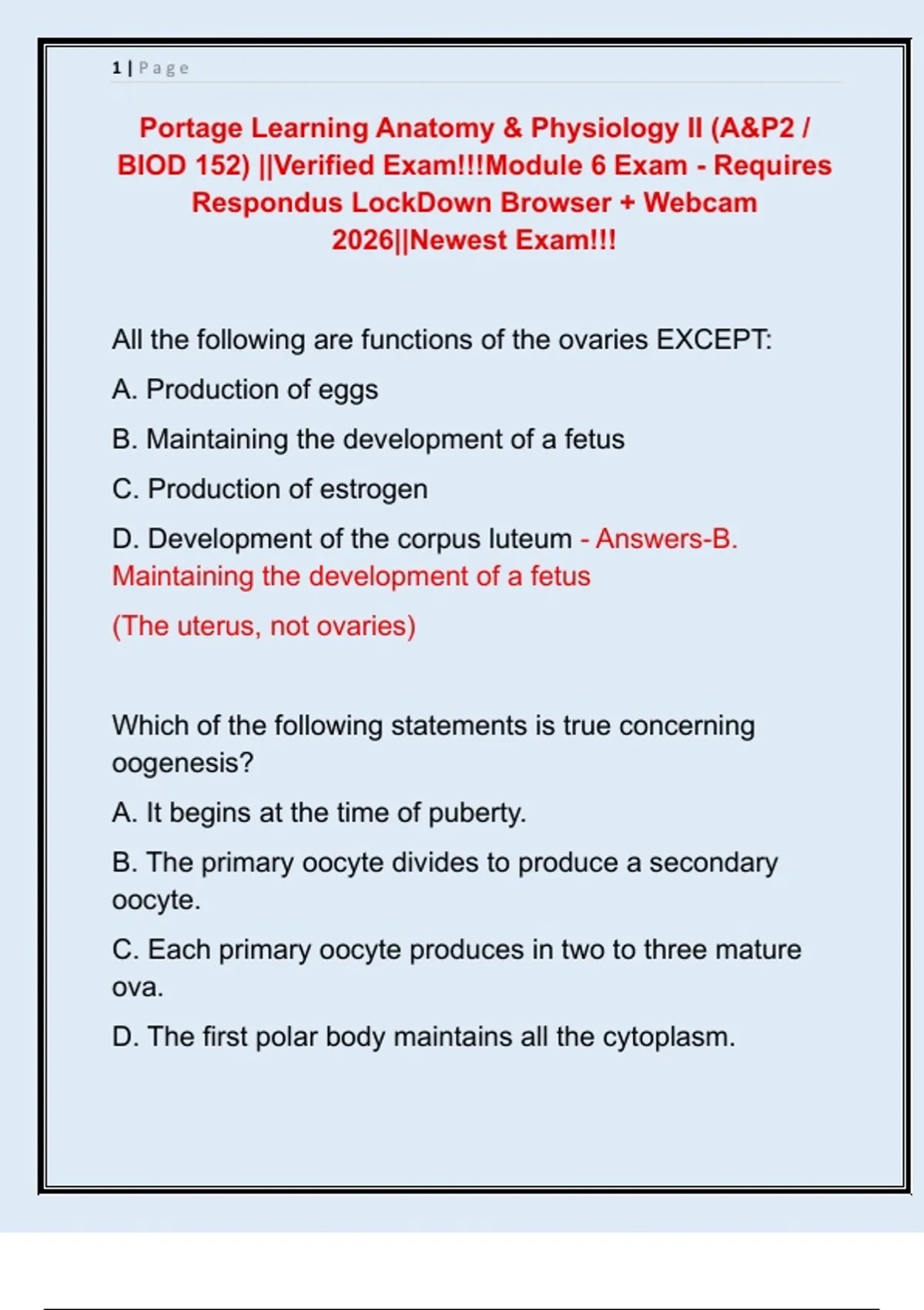 Portage Learning Anatomy & Physiology II (A&P2 / BIOD 152) ||Verified Exam!!!Module 6 Exam - Requires Respondus LockDown Browser + Webcam 2026||Newest Exam!!!