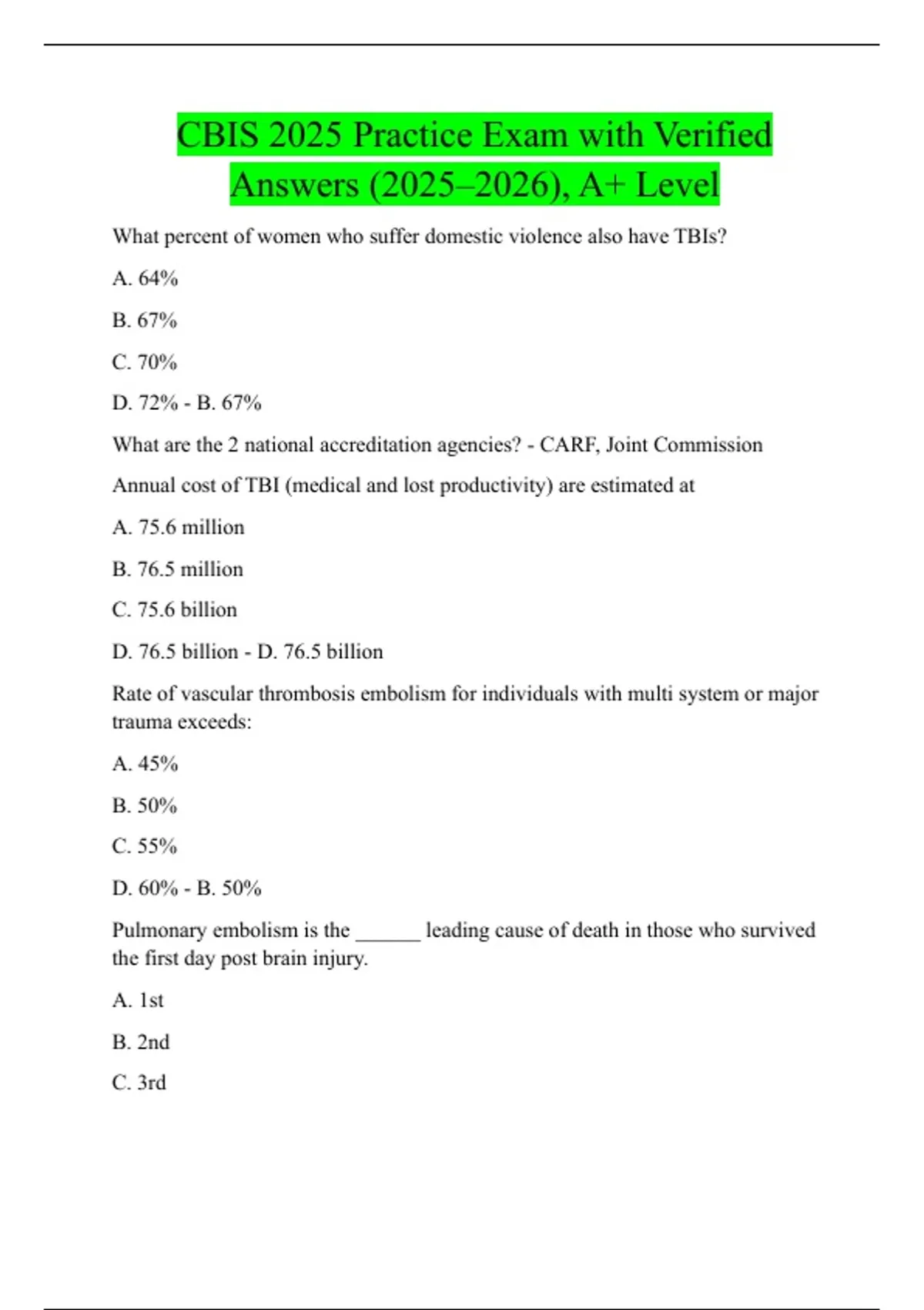 CBIS 2025 Practice Exam with Verified Answers (2025–2026), A+ Level What percent of women who suffer domestic violence also have TBIs? A. 64% B. 67% C. 70% D. 72% - B. 67% What are the 2 national accreditation agencies? - CARF, Joint Commission Annual cost of TBI (medical and lost productivity) are estimated at A. 75.6 million B. 76.5 million C. 75.6 billion D. 76.5 billion - D. 76.5 billion Rate of vascular thrombosis embolism for individuals with multi system or major trauma exceeds: A. 45% B. 50% C. 55% D. 60% - B. 50% Pulmonary embolism is the ______ leading cause of death in those who survived the first day post brain injury. A. 1st B. 2nd C. 3rd D. 4th - C. 3rd Why is Brain Injury considered the silent epidemic? - Many problems that result from a brain injury are not always readily apparent. a. The effects of the brain injury (BI), such as changes in thinking, may not be readily apparent to an outside observer b. Negative consequences occur when the general public and medical providers do not recognize the effect of BI: i. Problems at work/ school ii. Changes in personal relationships iii. Legal problems iv. Homelessness True or False? Brain Injury is frequently not identified. - True Define Acquired Brain Injury - An injury to the brain that is not hereditary, congenital, degenerative, or induced by birth trauma Acquired brain injury is an umbrella definition as it includes injuries caused by both __________ and __________ factors - external; internal Match the following ABI with its cause: Traumatic Impact- Open & Closed Causes (bank): Blast Assault GSW Hypoxia/ anoxia Fall Stabbing Ischemia Neurotoxic poisoning MVC Sports Tumor Infection CVA - Open: GSW, stabbing, fall, sports, MVC Closed: Blast, Assault, Fall, Sports, MVC Match the following ABI with its cause: Traumatic Internal: (3) - Sports, MVC, Fall Match the following ABI with its cause: Non-Tramatic