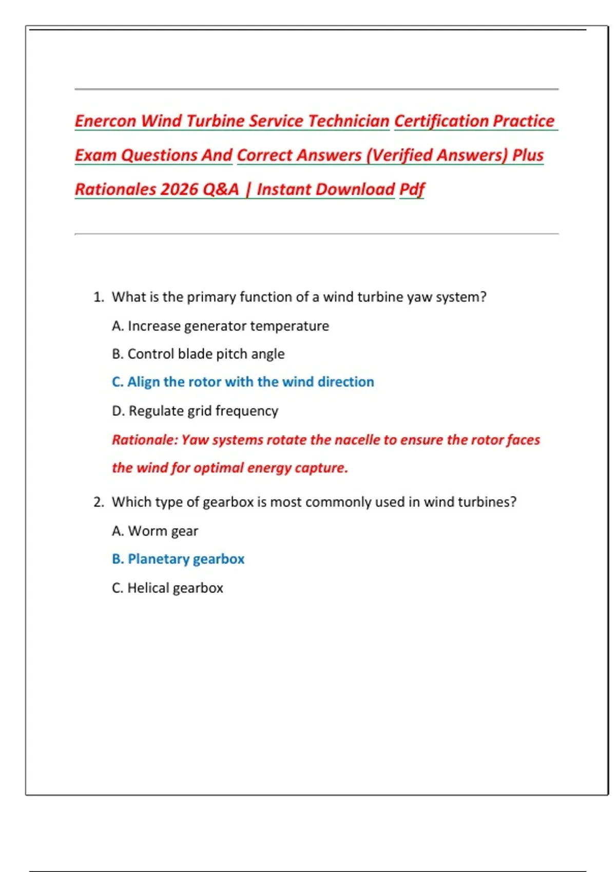 Enercon Wind Turbine Service Technician Certification Practice Exam Questions And Correct Answers (Verified Answers) Plus Rationales 2026 Q&A | Instant Download Pdf