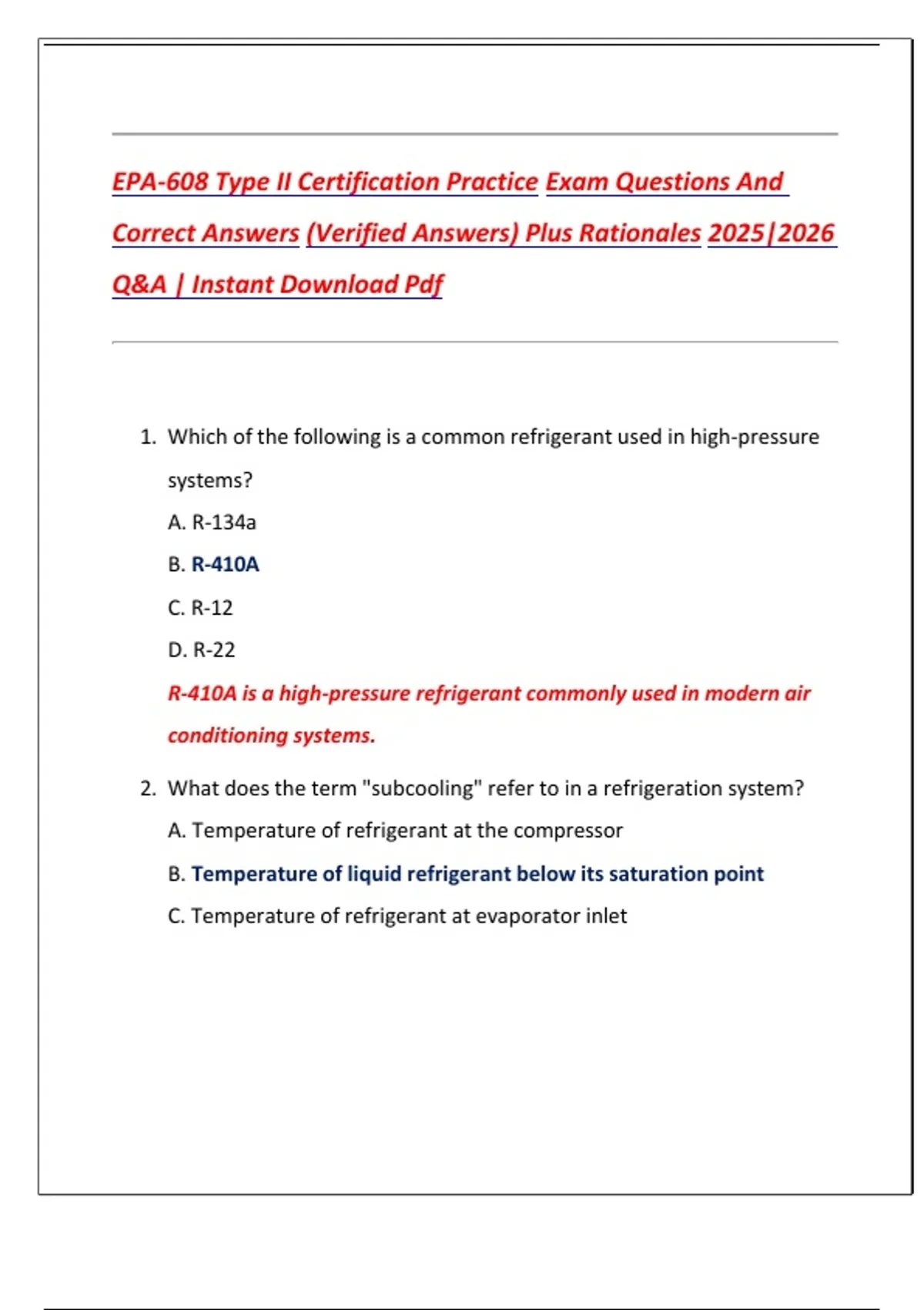 EPA-608 Type II Certification Practice Exam Questions And Correct Answers (Verified Answers) Plus Rationales 2025|2026 Q&A | Instant Download Pdf