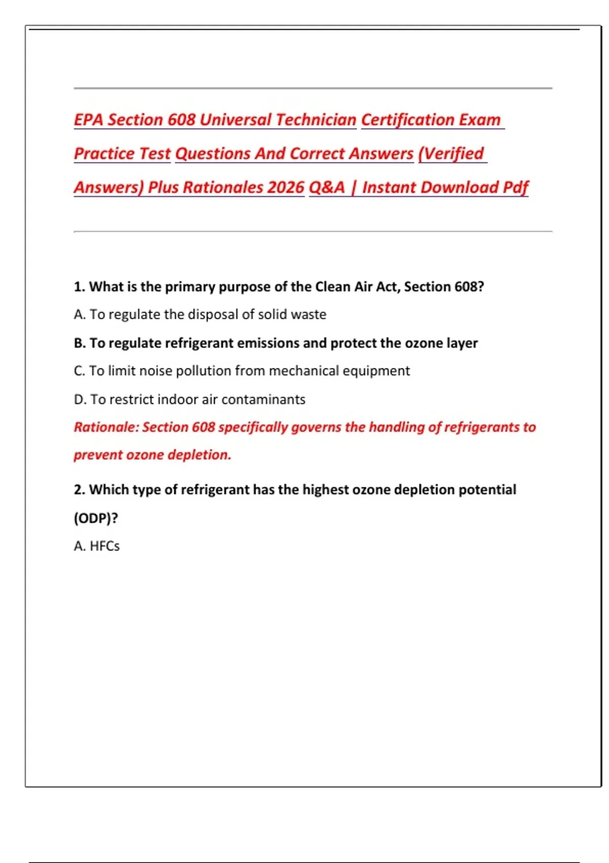 EPA Section 608 Universal Technician Certification Exam Practice Test Questions And Correct Answers (Verified Answers) Plus Rationales 2026 Q&A | Instant Download Pdf