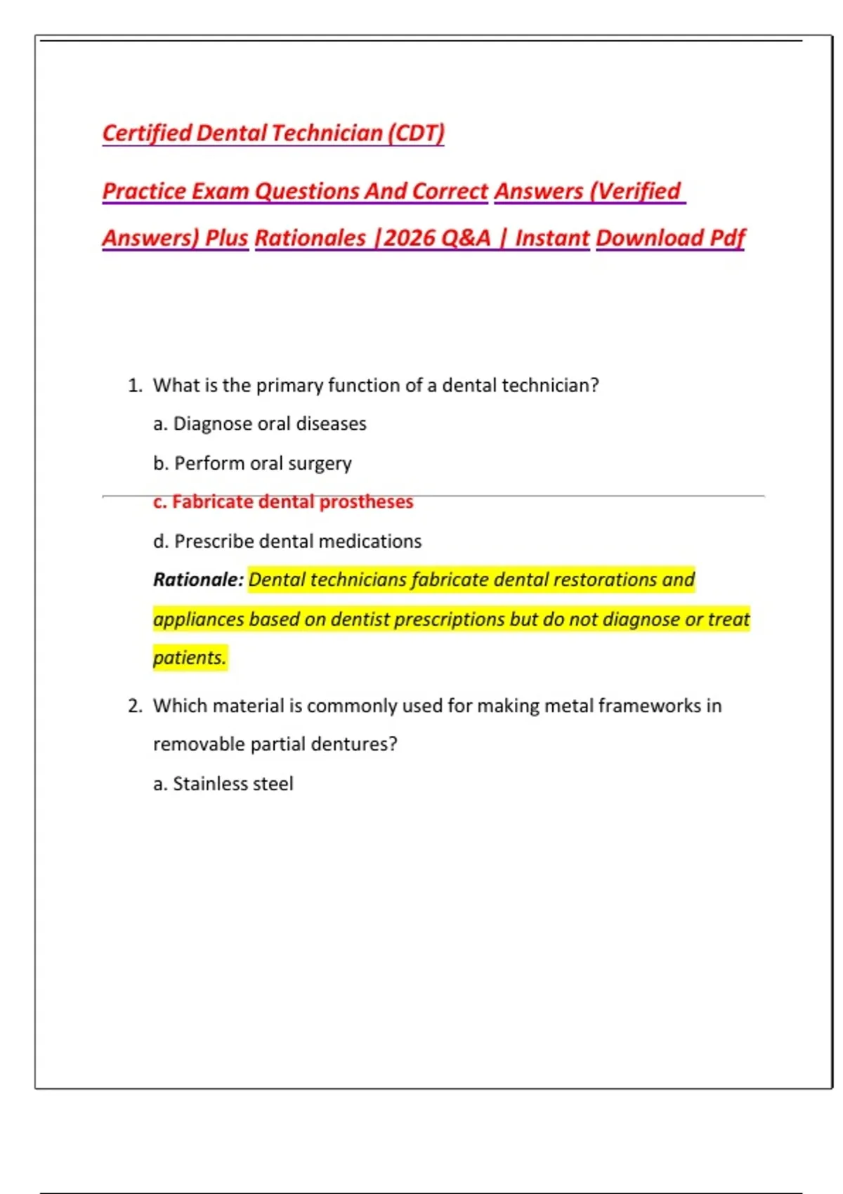 Certified Dental Technician (CDT) Practice Exam Questions And Correct Answers (Verified Answers) Plus Rationales |2026 Q&A | Instant Download Pdf