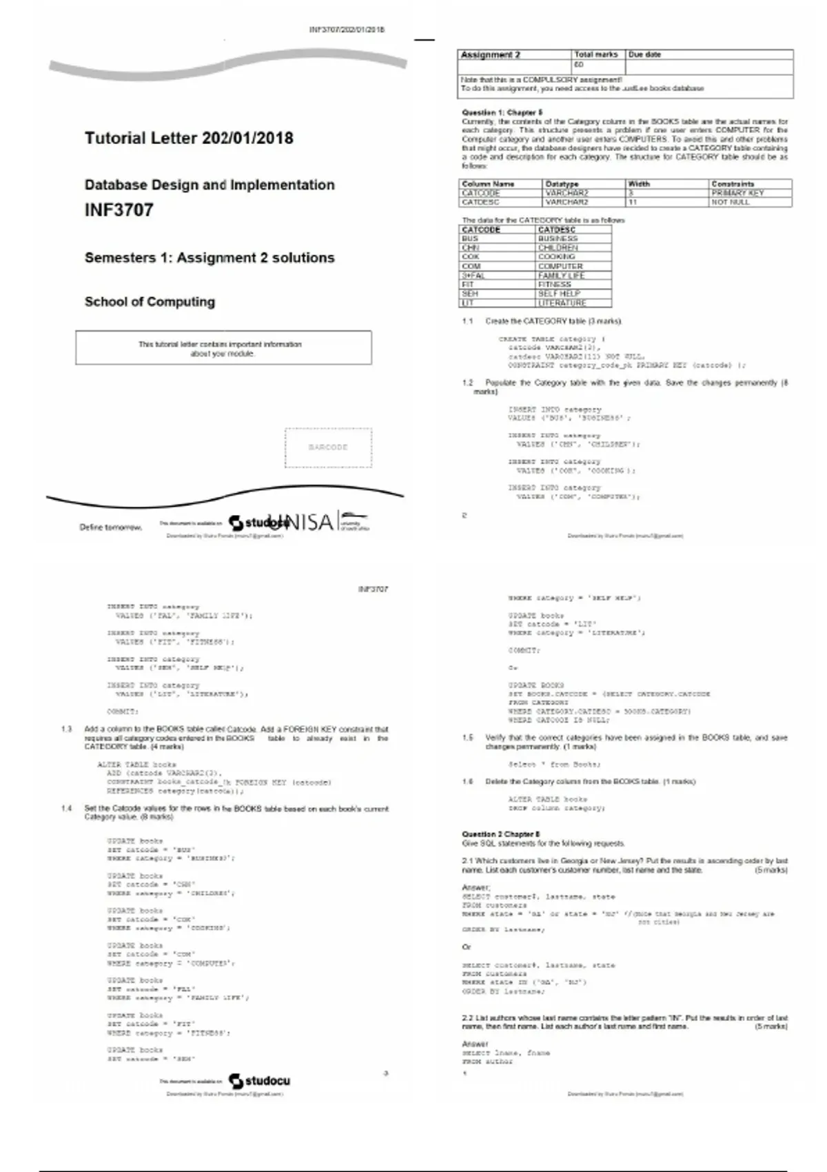 INF3707 Database Implementation guide focusing on translating designs into SQL: table creation, keys, constraints, views, indexes, transactions, and testing. Perfect for UNISA INF3707 assignments, practicals, and exam preparation (2025).