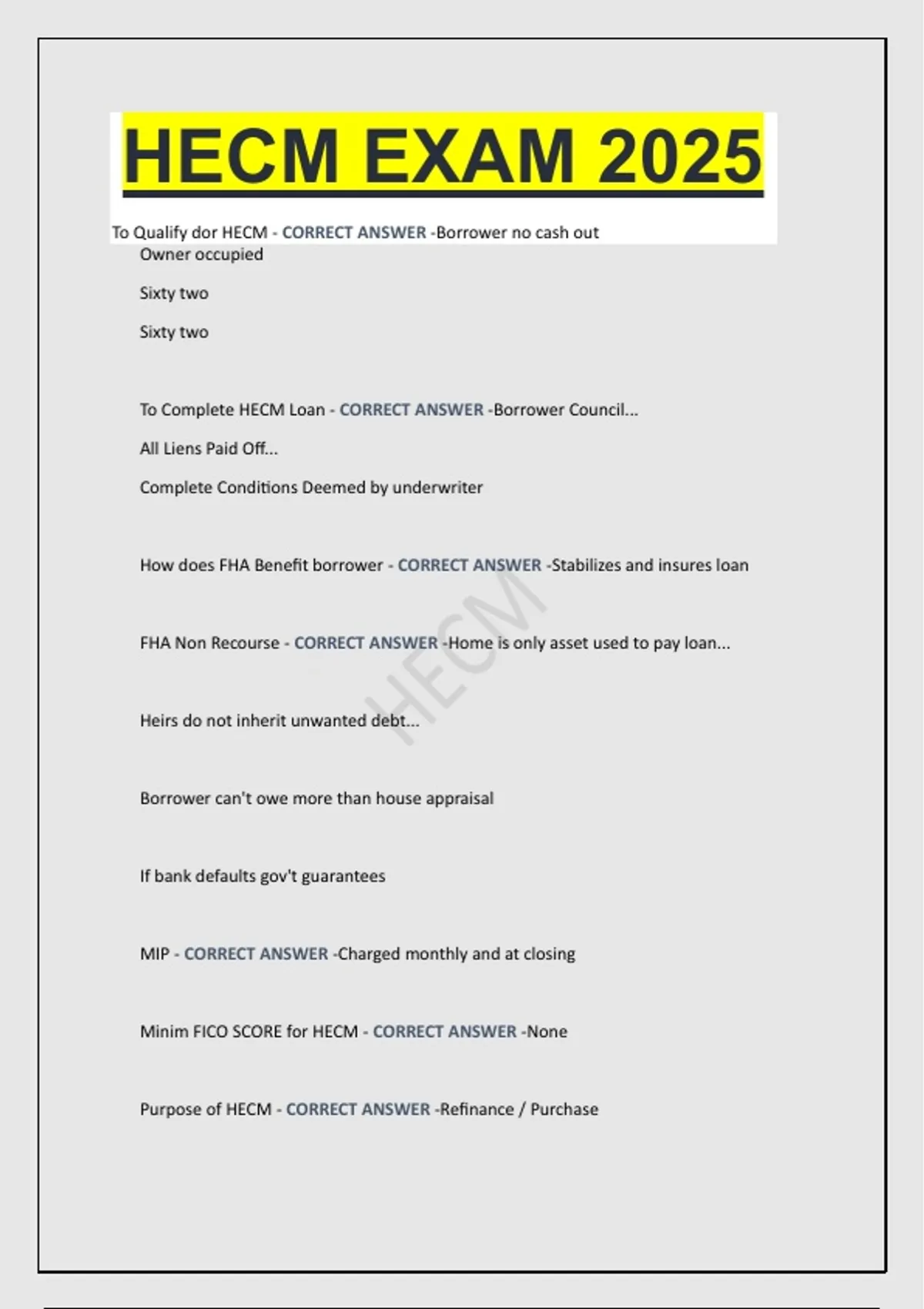 To Qualify dor HECM - CORRECT ANSWER -Borrower no cash out