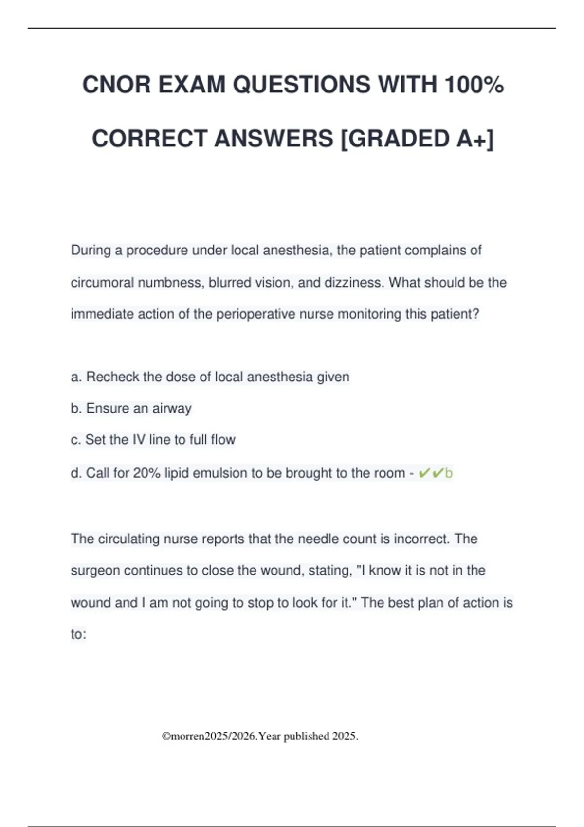 CNOR EXAM QUESTIONS WITH 100% CORRECT ANSWERS [GRADED A+] During a procedure under local anesthesia, the patient complains of circumoral numbness, blurred vision, and dizziness. What should be the immediate action of the perioperative nurse monitoring this patient? a. Recheck the dose of local anesthesia given b. Ensure an airway c. Set the IV line to full flow d. Call for 20% lipid emulsion to be brought to the room - b The circulating nurse reports that the needle count is incorrect. The surgeon continues to close the wound, stating, "I know it is not in the wound and I am not going to stop to look for it." The best plan of action is to: ©morren2025/2026.Year published 2025. a. Accept the surgeon's response without comment and fill out an incident report b. Inform the surgeon of hospital policy and document subsequent actions c. Order X-rays regardless of the surgeon's wishes d. Notify the OR supervisor and ask for advice - b A new employee unknowingly dispensed an unsterile solution to the sterile field. The following day, the supervisor learns of the incident. The supervisor's first action would be to: a. Initiate an incident report b. Instruct the employee on the technique of reading labels c. Counsel the employee verbally d. Notify the surgeon of the break in technique - d Due to an emergency, the perioperative nurse is unable to conduct the sponge, sharps, and instrument counts. At the conclusion of the surgery, the nurse should: a. Ask the surgeon to sign the count ©morren2025/2026.Year published 2025. b. Immediately notify the OR supervisor c. Document the absence of counts d. Refuse to sign the sponge count record - c The optimum patient position provides: a. Access and exposure, maintains circulatory and respiratory functions, and does not compromise neuromuscular structures. b. Optimum access and exposure to surgical site, with no permanent compromise to neuromuscular structures. c. Access for the surgeon, does not compromise the neuromuscular structures, and maintains an adequate airway for the anesthetist. d. Sustained circulatory and respiratory functions, does not compromise neuromuscular structures, and maintains body alignment. - a A patient who is 8 months pregnant is to undergo an emergency laparotomy. In planning nursing care for this patient, the perioperative nurse should have available a wedge cushion or pillow to place under the patient's: ©morren2025/2026.Year published 2025.