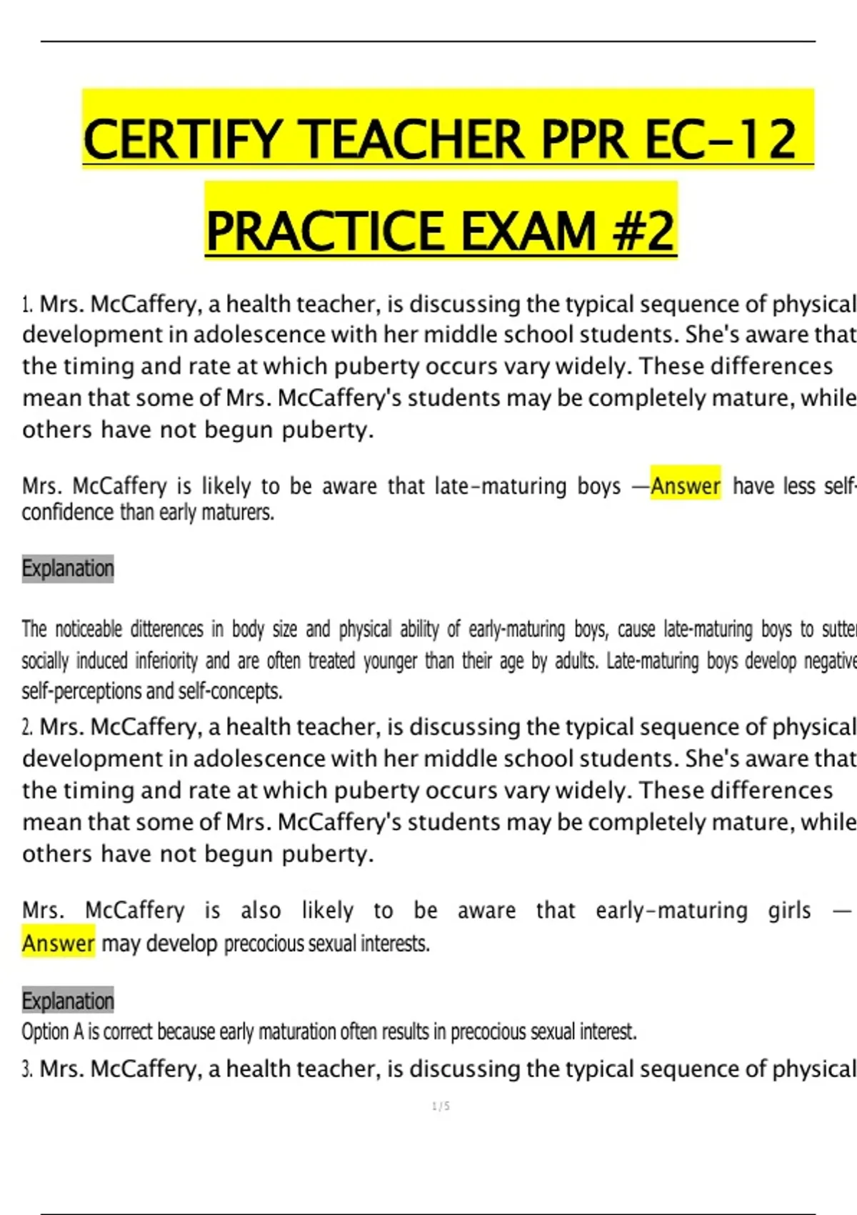 This document is a targeted practice exam and answer guide for the Certify Teacher PPR EC-12 (160) exam, focusing on Pedagogy and Professional Responsibilities scenarios commonly tested on the Texas teacher certification assessment. It includes exam-style multiple-choice questions with clearly identified correct answers and detailed explanations covering student development, motivation, instructional strategies, classroom management, assessment, metacognition, learning theory (Piaget, Maslow), and effective teaching practices. The guide is ideal for teacher candidates preparing for the PPR EC-12 exam, especially those using Certify Teacher and looking for scenario-based practice with rationales. Its concise format makes it perfect for last-minute review, concept reinforcement, and test-day readiness, helping candidates understand why an answer is correct, not just what the answer is.
