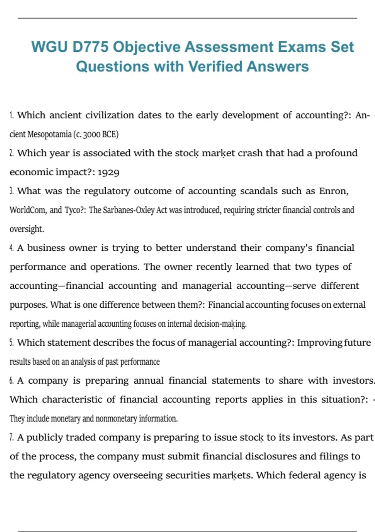 This document contains a complete set of objective assessment exam questions with verified correct answers for WGU D775. It covers all major competencies assessed in the course and is structured to align closely with WGU’s objective assessment format, making it ideal for focused study, revision, and exam preparation for the 2026/2027 academic year.
