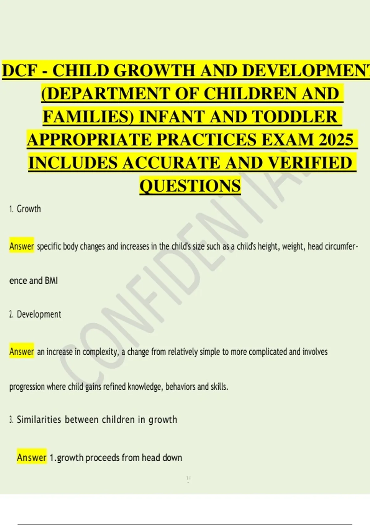 This document is a comprehensive question-and-answer study guide for the DCF (Department of Children and Families) Child Growth and Development Exam – Infant and Toddler Appropriate Practices (2025). It includes accurate and verified exam questions with correct answers covering growth vs development, principles of child development, developmental domains, Maslow’s Hierarchy of Needs, Erikson’s psychosocial stages, Piaget’s cognitive development stages, Vygotsky’s theory and scaffolding, Montessori principles, attachment theory, heredity influences, health and wellness factors, routines, inclusion, developmental disabilities, ADA and IDEA, behavior supports, and developmentally appropriate practices (DAP). Designed for childcare providers, early childhood educators, and DCF exam candidates, this guide closely follows the official exam content and terminology. It is ideal for exam preparation, refresher training, and last-minute review, helping candidates confidently meet Florida DCF training and certification requirements.