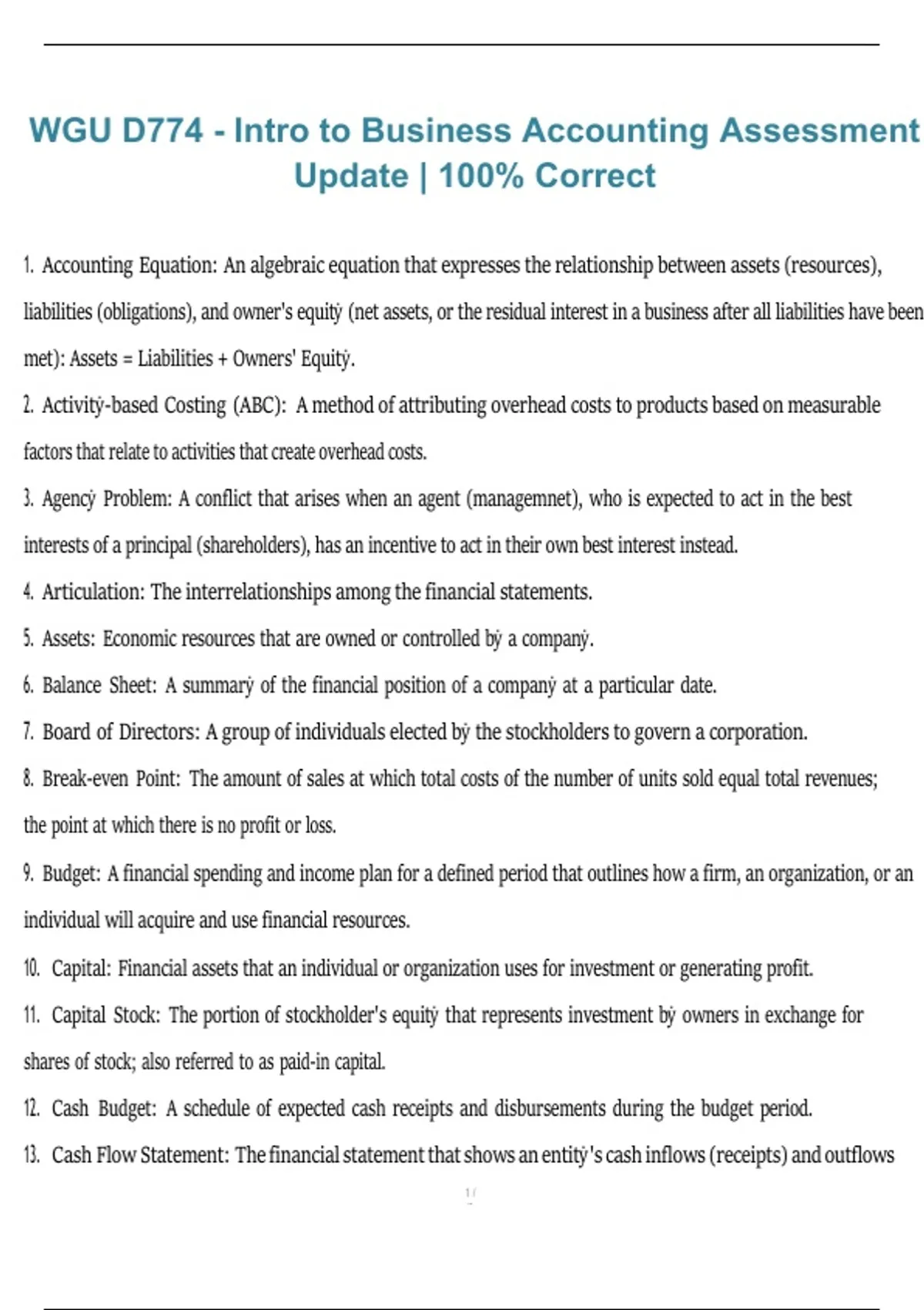 This document contains updated assessment exam questions with fully correct answers for WGU D774 Introduction to Business Accounting. It covers key accounting principles, financial statements, the accounting cycle, and core business accounting concepts aligned with the latest 2026/2027 assessment updates, making it ideal for exam preparation and confident review.